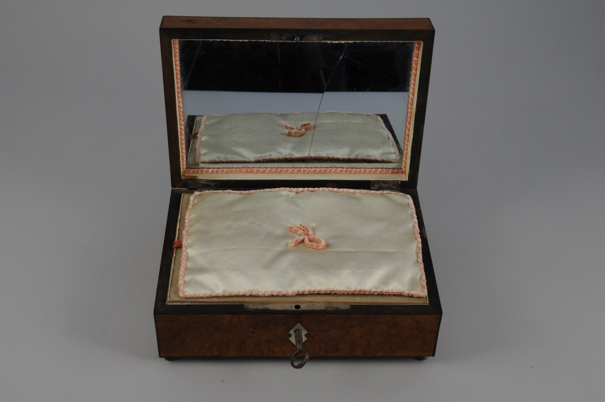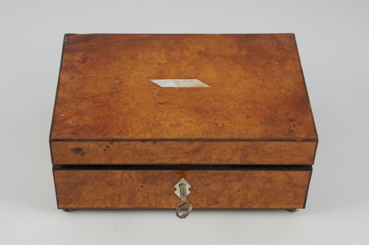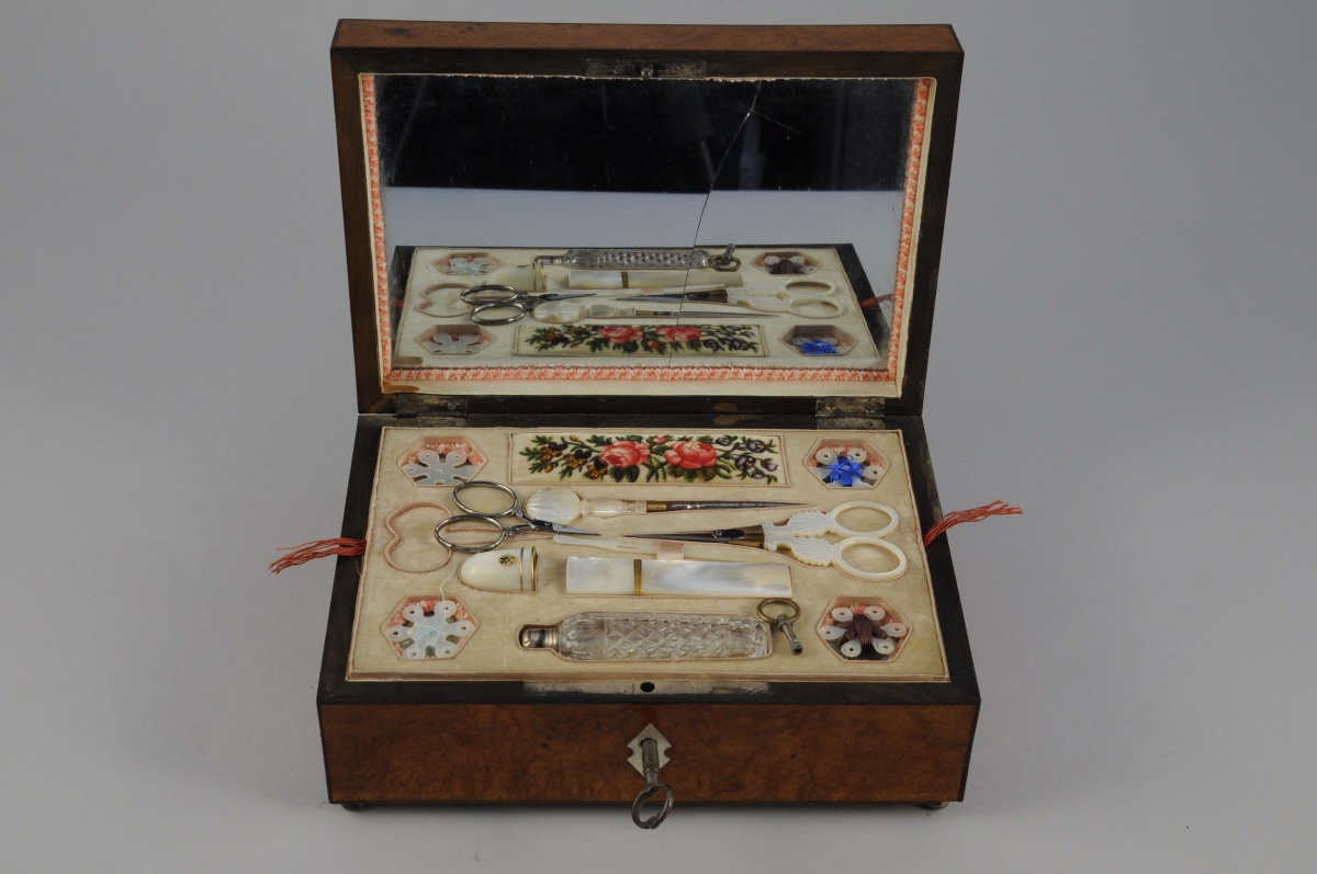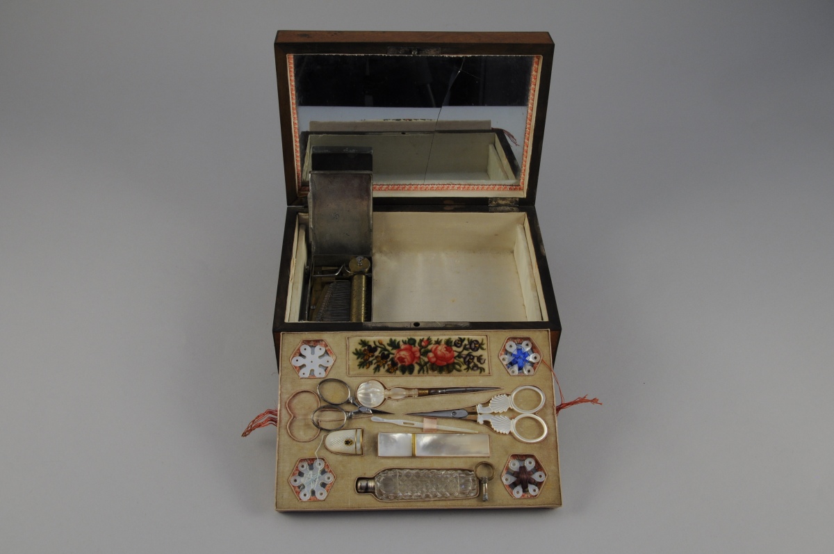 NÉCESSAIRE À COUTURE en nacre comprenant une paire de ciseaux, la prise ornée de palmettes et la monture en vermeil, un étui à aiguilles orné de filets or, un dé à coudre centré d'un médaillon émaillé d'une pensée et filets or, un poinçon, un passe-fil, un flacon à sels en cristal taillé et bouchon en argent et quatre bobines. Poinçon de petite garantie sur le vermeil et l'argent, 1809-1819. Dans un COFFRET À MUSIQUE de forme rectangulaire en placage de loupe d'amboine et filets de bois sombre. Le couvercle centré d'une pièce de nacre marquetée et foncé d'un miroir. Entrée de serrure en nacre.