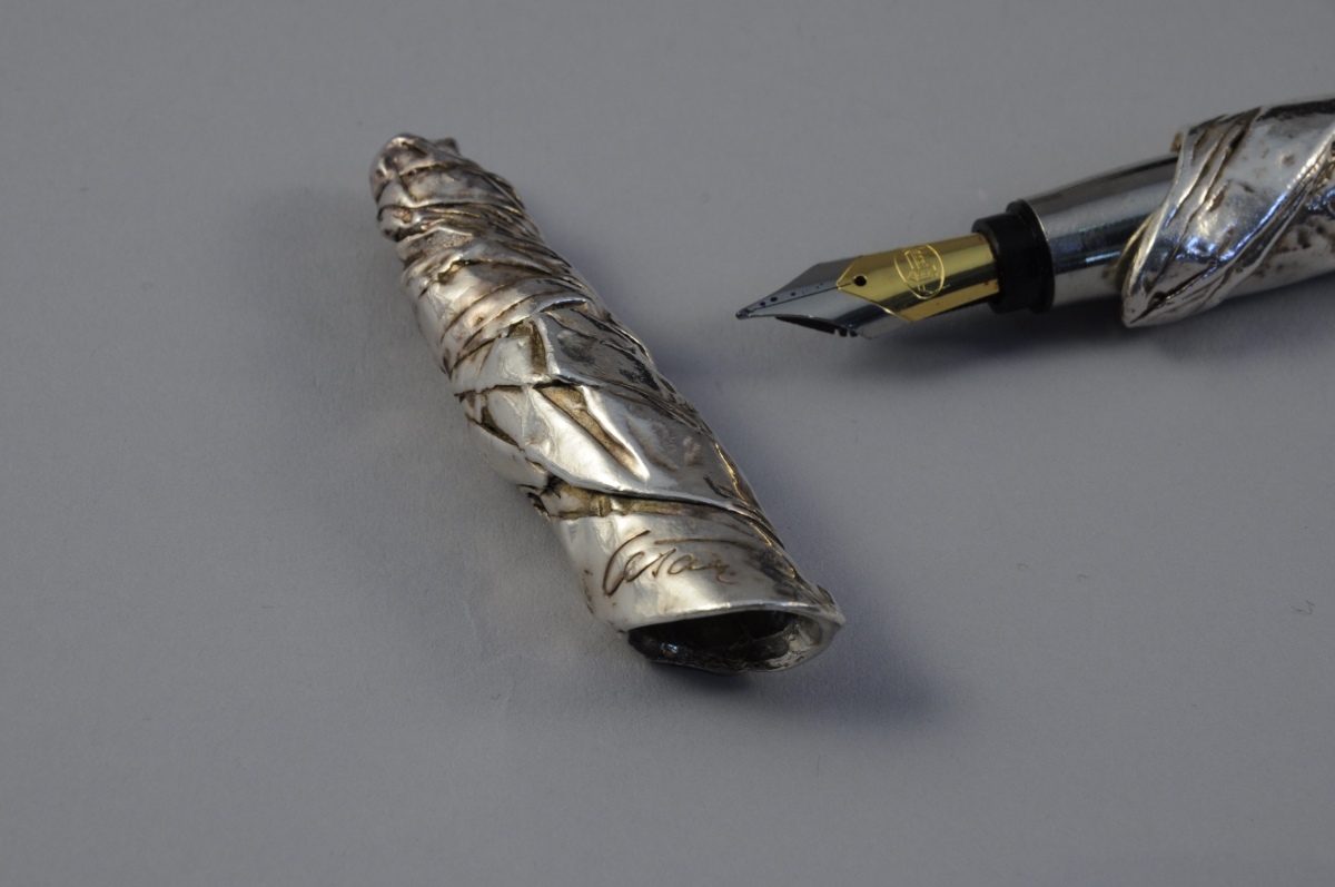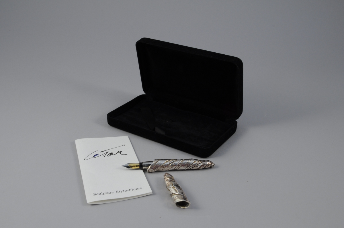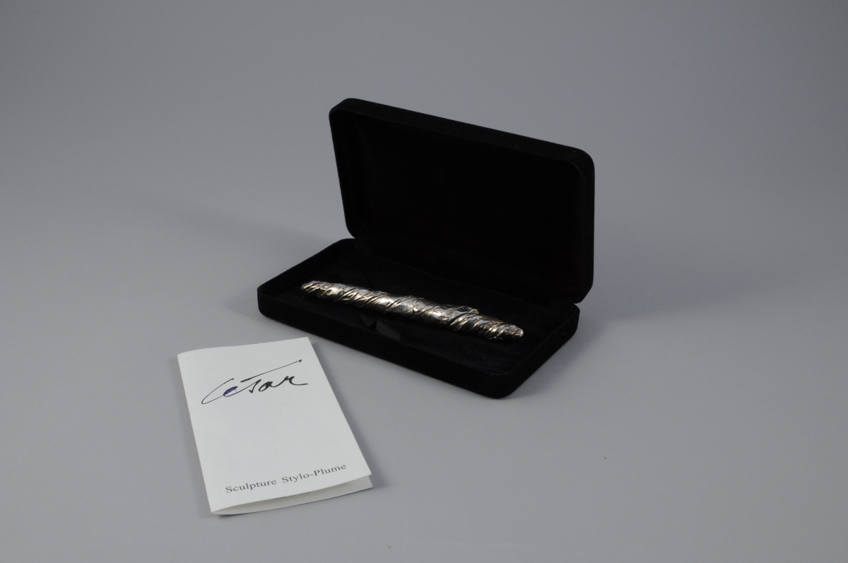Stylo plume en étain argenté à effet papier froissé. Dans on étui avec un certificat d'authenticité daté 1995 et numéroté A688/1000.