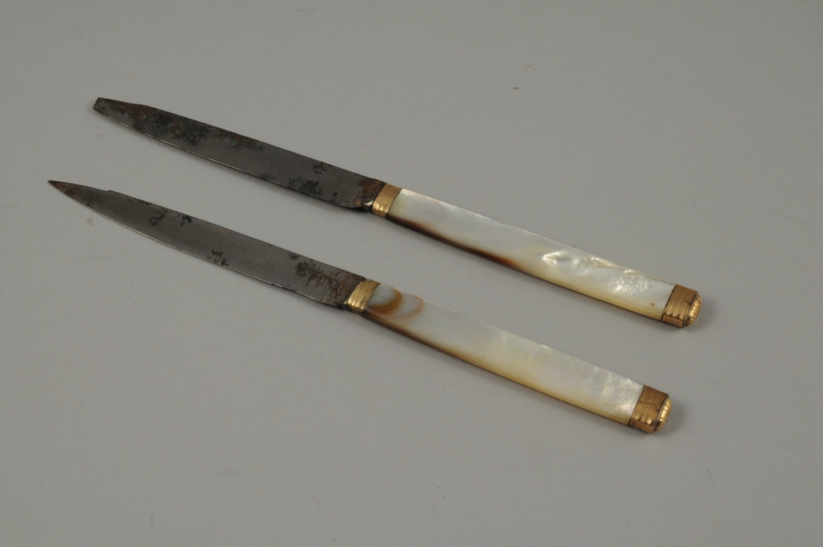 PAIRE de COUTEAUX, le manche en nacre bagué d'or et lame en métal. Long. 18,8 et 19 cm. Fin du XVIIème, début du XIXème. (manques et accidents, lames oxydées).