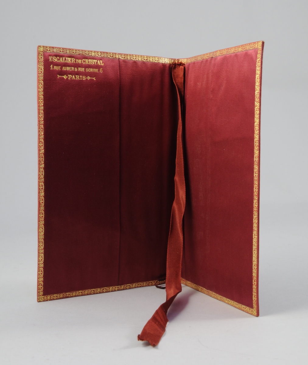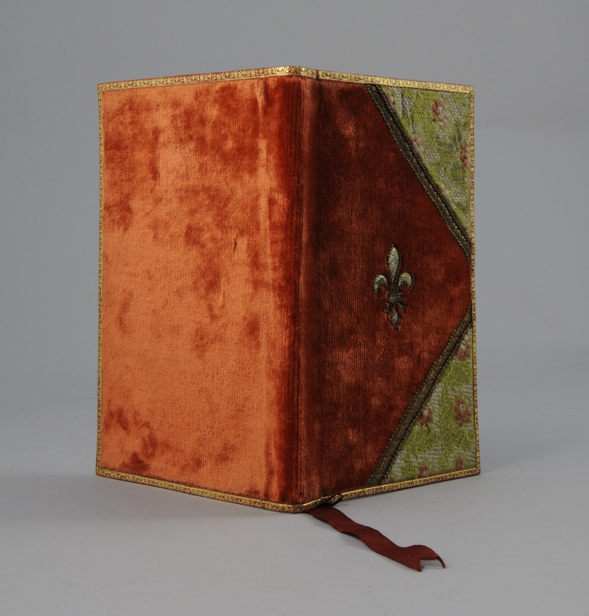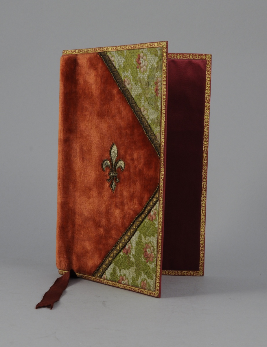 RELIURE en velours, semi de fleurettes et fleur de lys au centre entourée de maroquin doré. Intérieur en soie.