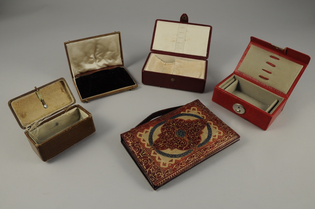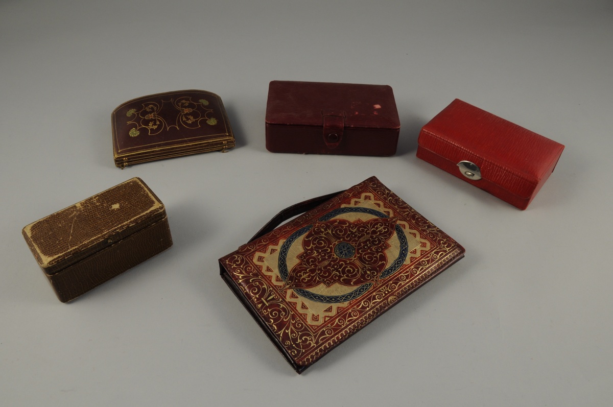 Quatre COFFRETS et un PORTEFEUILLE en cuir et un en cartonnage.