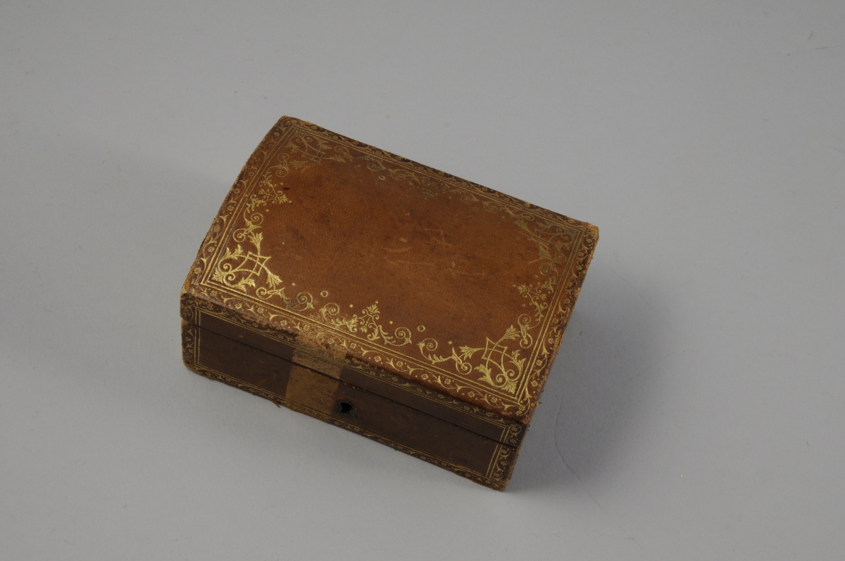 COFFRET en maroquin fauve à décor doré aux petits fers de rinceaux feuillagés et fleuris. Marqué "J. CHALMETTE".