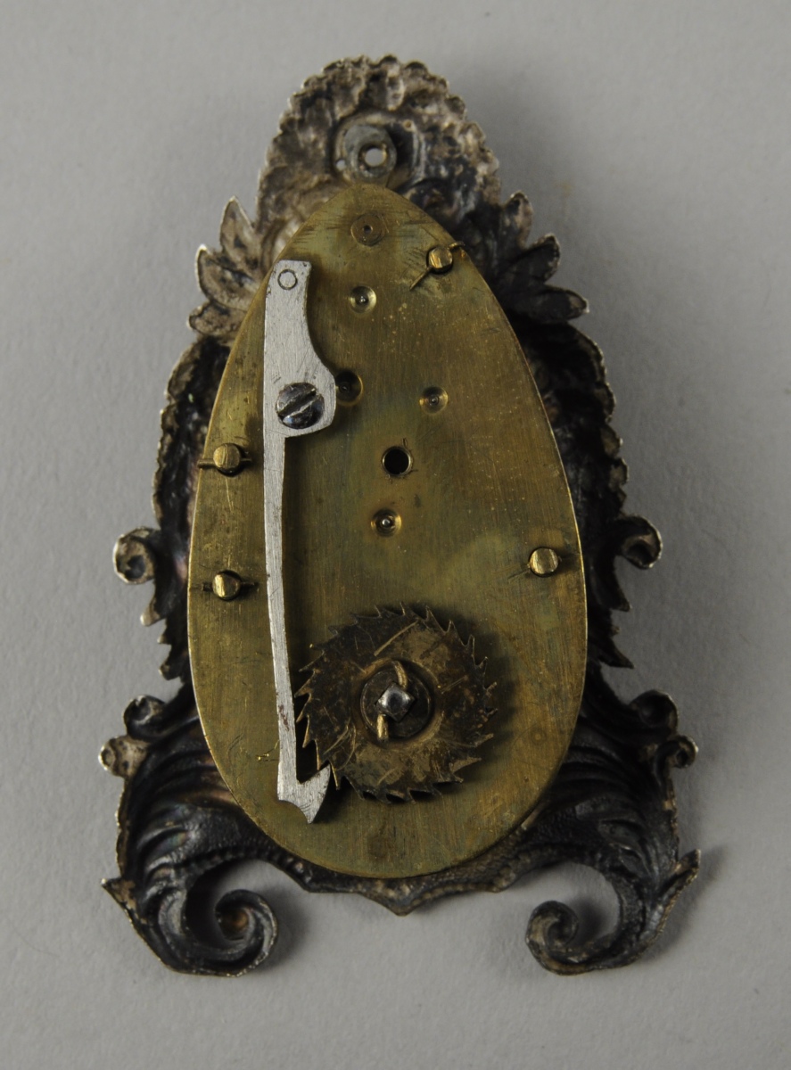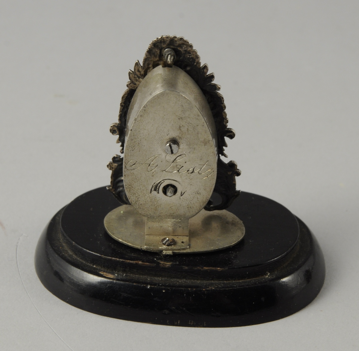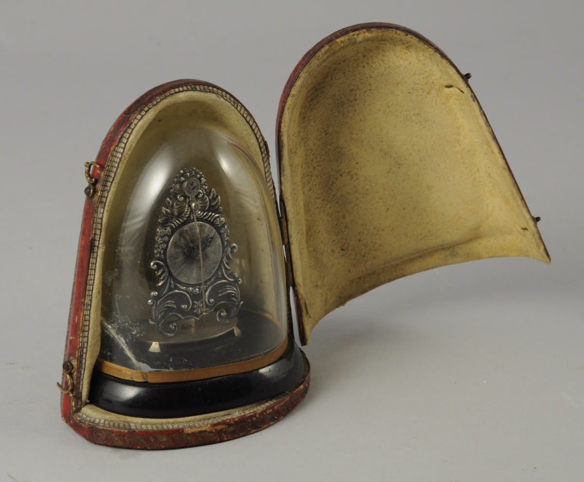 PENDULETTE miniature, dite de poupée. Style étranger composite, signé A List sur la platine arrière. Globe verre accidenté. Écrin en maroquin rouge ancien gainé de peau chamois.