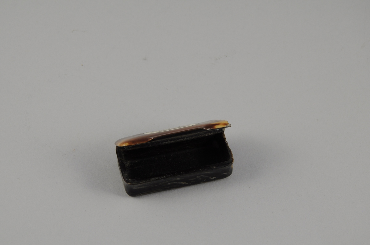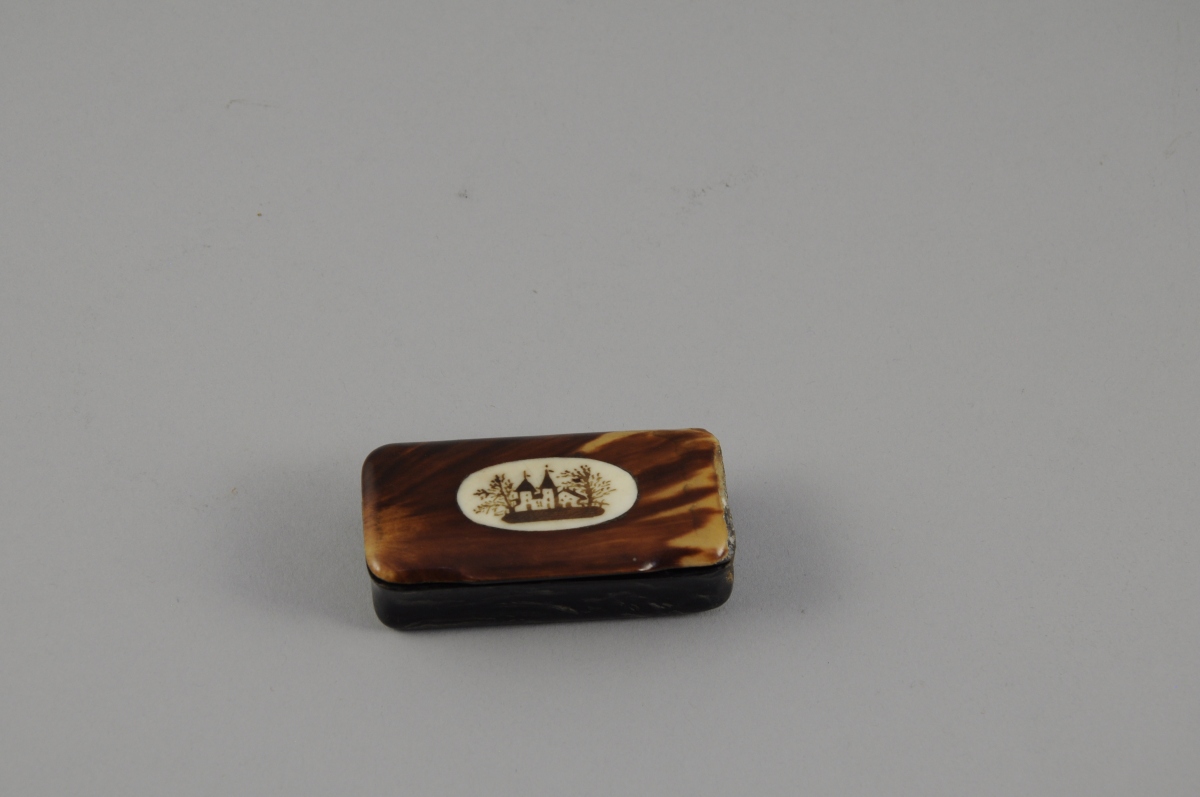 TABATIÈRE rectangulaire en bois noirci et corne. Le couvercle orné d'un paysage au château sur un médaillon ovale en ivoire. Fin XVIIIème. Haut. 2, Long. 7, Prof. 3 cm. (manques, usures)