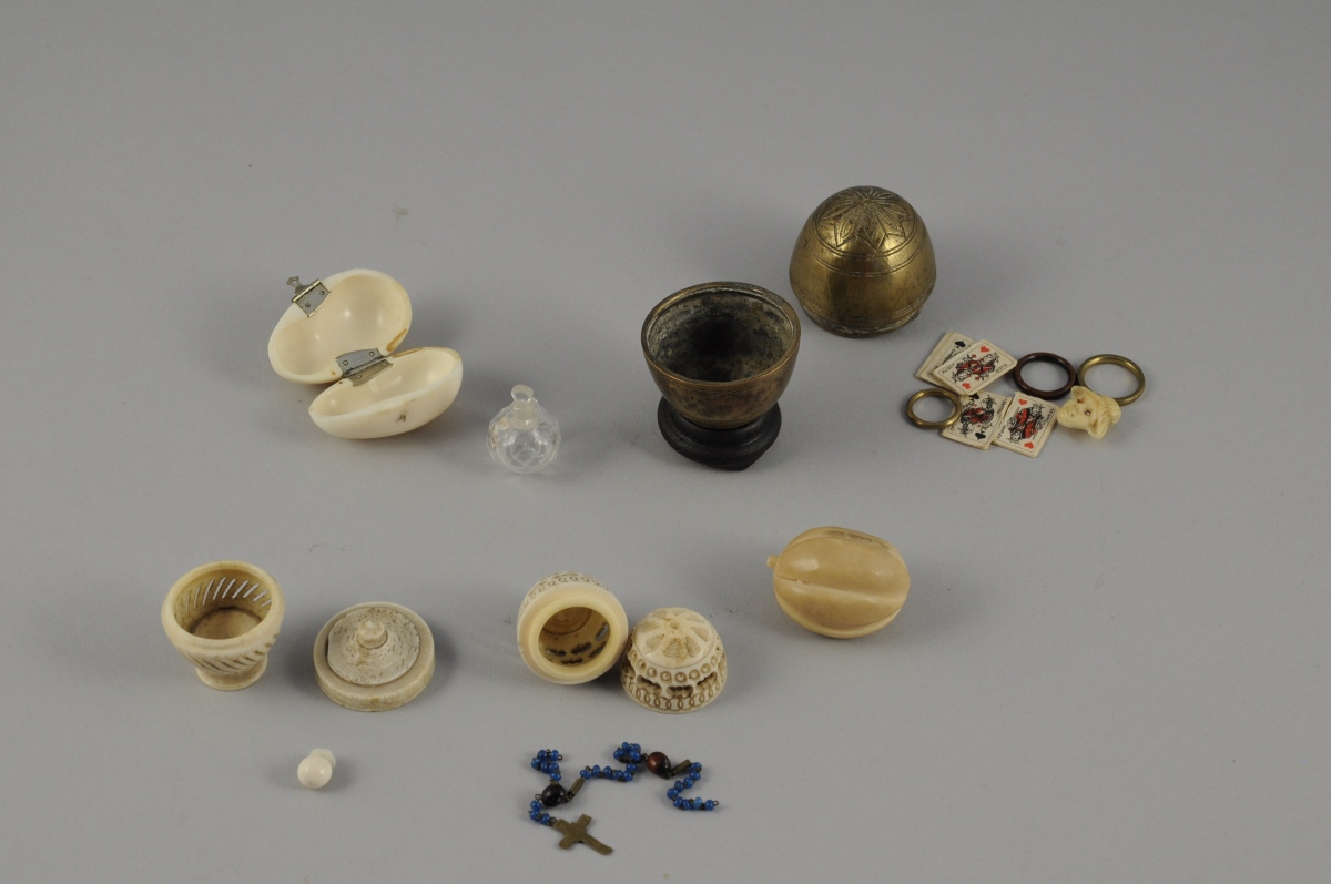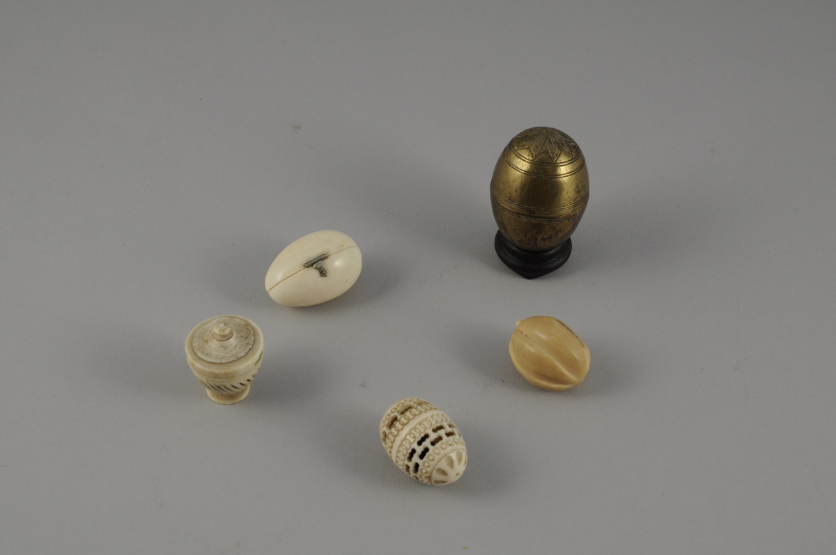 - OEUF miniature en os ajouré et gravé. Il s'ouvre en deux parties et renferme un patit chapelet (manque, accident). Avec un support en bois noirci. Haut. 4, Diam. 2,7 cm.
