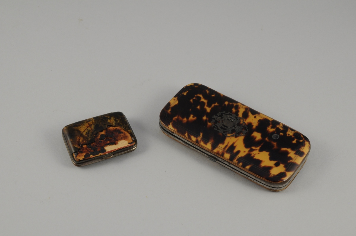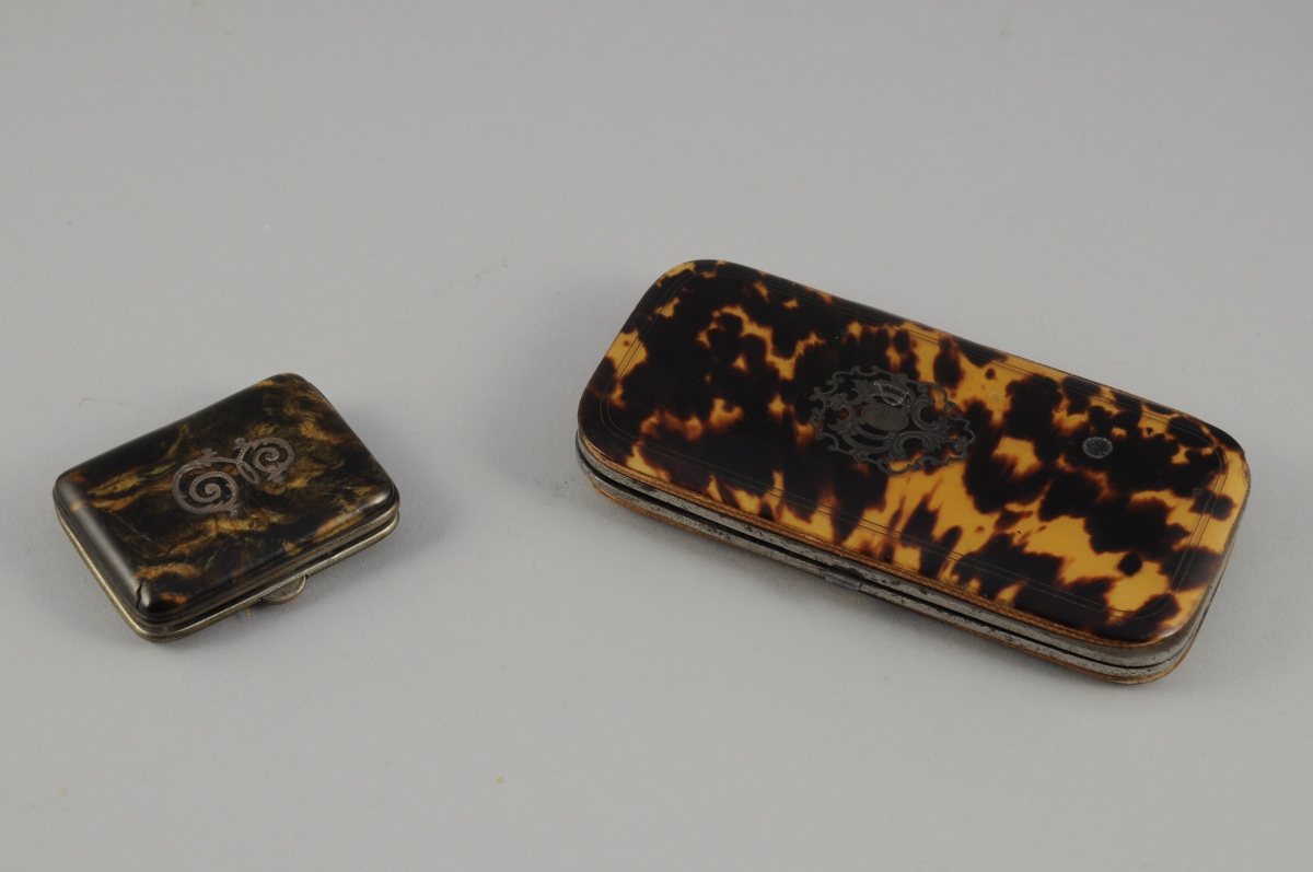 JOINT : PORTE-MONNAIE en corne à décor incrusté de volutes. Seconde moitié du XIXème. Long. 6, larg. 4,5 cm. (accident, manques)