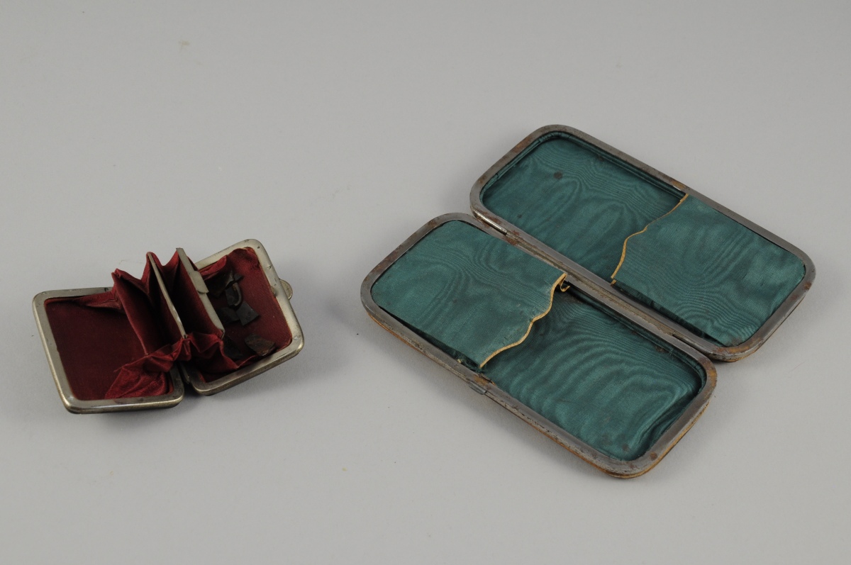ÉTUI à CIGARES rectangulaire en écaille à décor incrusté au centre d'un cartouche mouvementé et de filets en argent. L'intérieur foncé de tissu moiré vert. Seconde moitié du XIXème. Long. 14, Larg. 7 cm. (fermoir accidenté, oxydation)