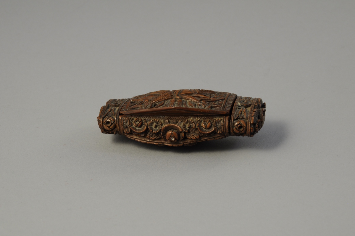 TABATIÈRE en corrozo : couvercle aux carquois et pigeons se becquetant - dos à la rencontre d'un couple. XVIIIème. Long. 8,5 Larg. 3,5 cm. XIXème. (accdt. charnière)