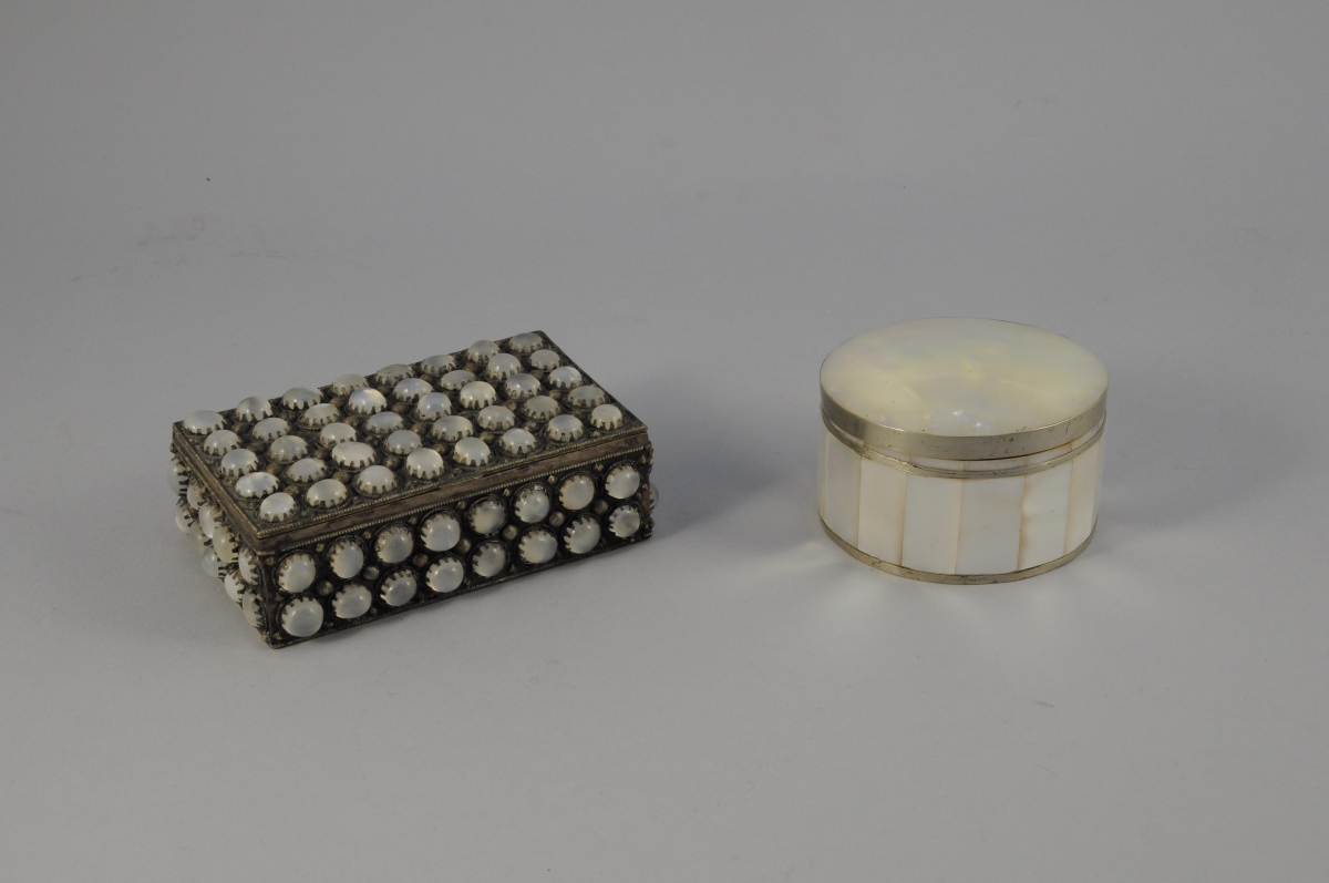 - BOÎTE ronde en nacre à couvercle bombé. Monture en métal argenté. Haut. 6 cm. Diam. 9,5 cm.