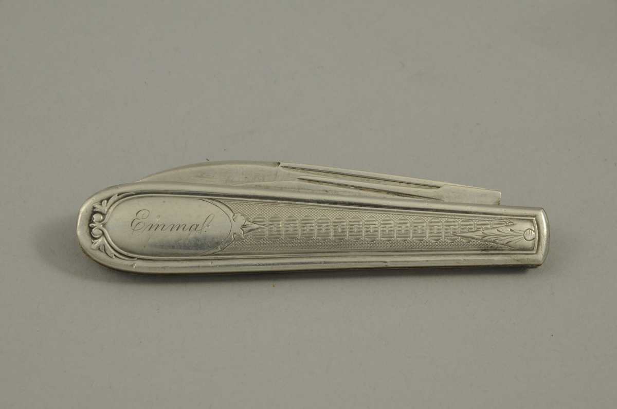 CANIF en argent et métal à décor guilloché. Orné de deux médaillons de forme ovale, l'un gravé "Emma", le second "Van Duzer". Poinçons anglais sur la lame du couteau. Début du XXème.