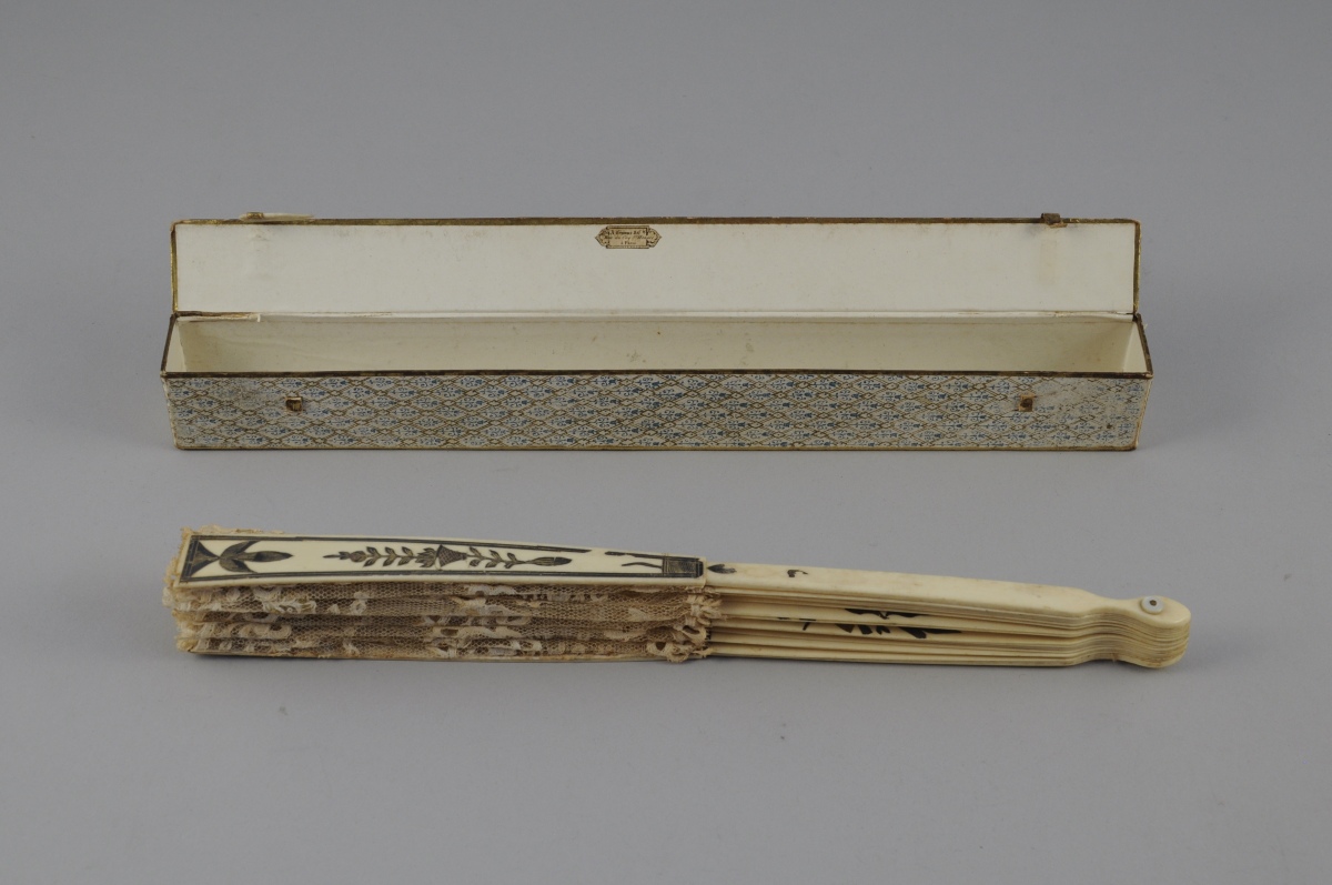 ÉVENTAIL plié. La feuille en dentelle blanche ornée de chutes de fleurs brodée de sequins or. Monture en os incrustée d'un motif floral en métal argenté et doré. Dans une boîte signée "A Giroux & Cie / Rue du Coq St Honoré / à Paris".