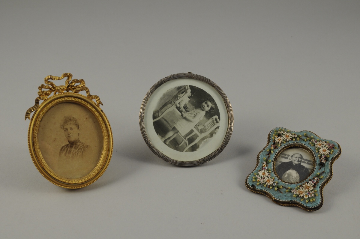 - un de forme ovale en métal doré, avec frise d'eau, de perles et sommé d'un ruban. style Louis XVI. Haut. 10, Larg. 7,5 cm.