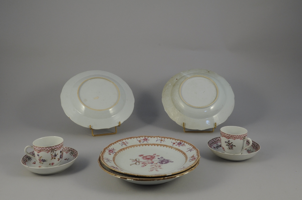 Suite de trois ASSIETTES plates en porcelaine de la famille rose. Ornées d'un bouquet de fleurs, frise de festons et fleurettes sur l'aile. XIXè.