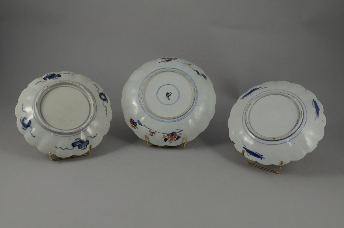 JAPON. Lot de TROIS ASSIETTES CREUSES IMARI à décor de fleurs de chrysanthèmes et pivoines.