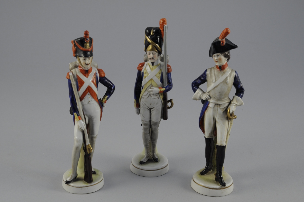 SAXE. Trois STATUETTES de MILITAIRES en PORCELAINE polychrome, dans le goût Saxe, tels que fantassin, grognard et cuirassier.