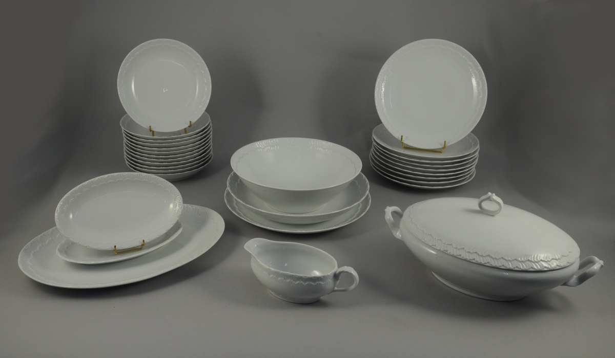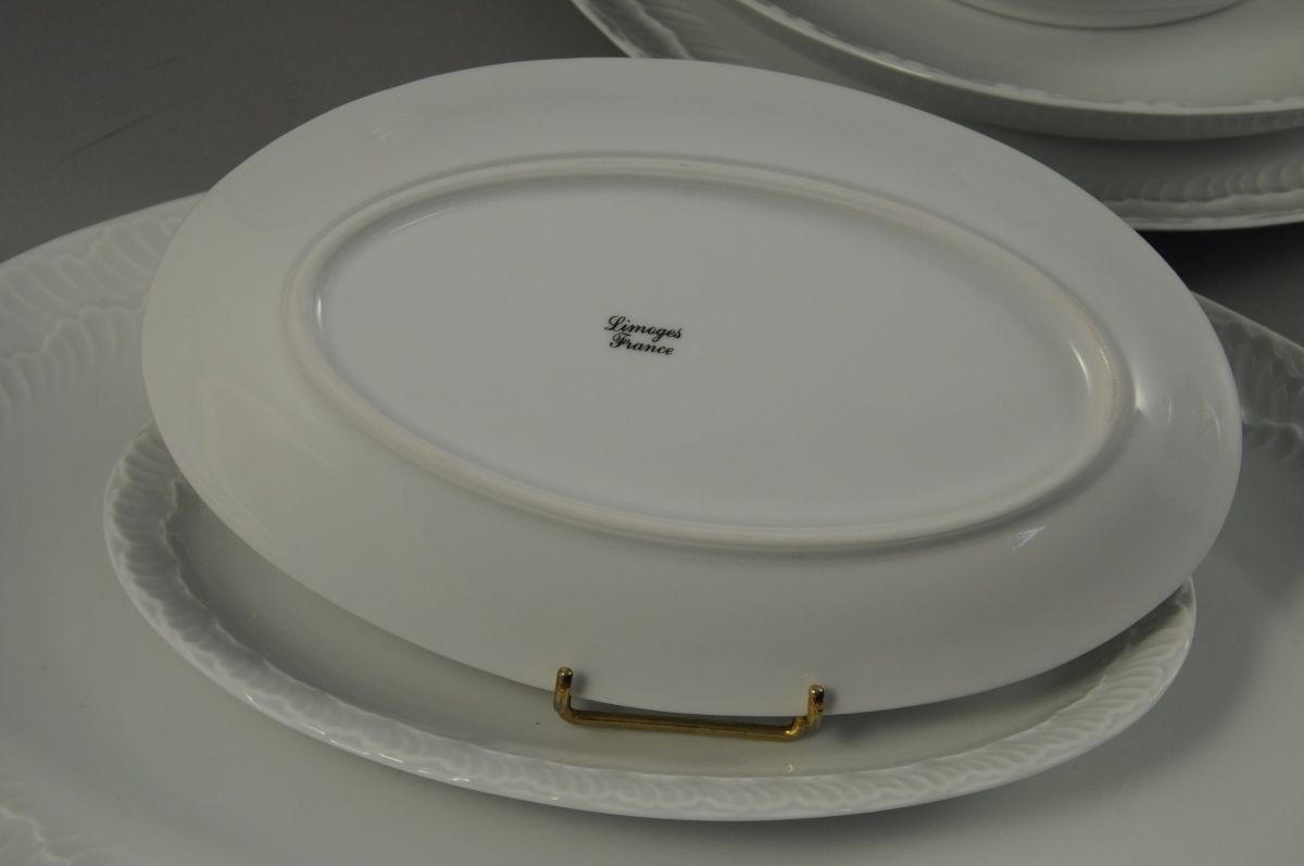 LIMOGES. SERVICE DE TABLE de 44 pièces en porcelaine blanche. Comprenant 24 assiettes plates, 12 assiettes creuses, saladier, saucière, deux plats ronds, deux raviers, plat ovale, soupière. Décor de feuillage stylisé en relief sur l'aile.