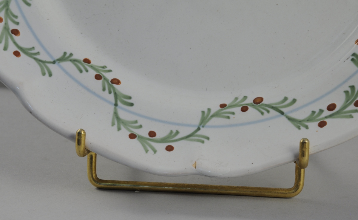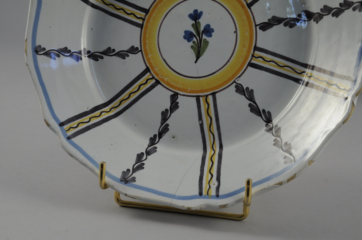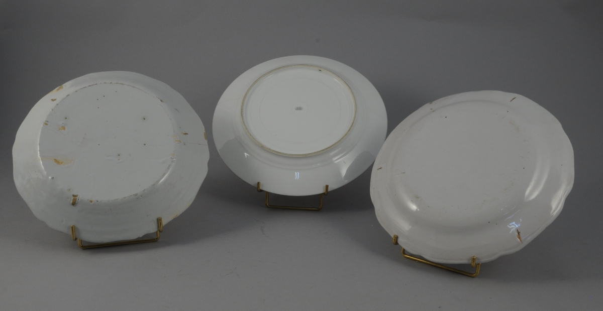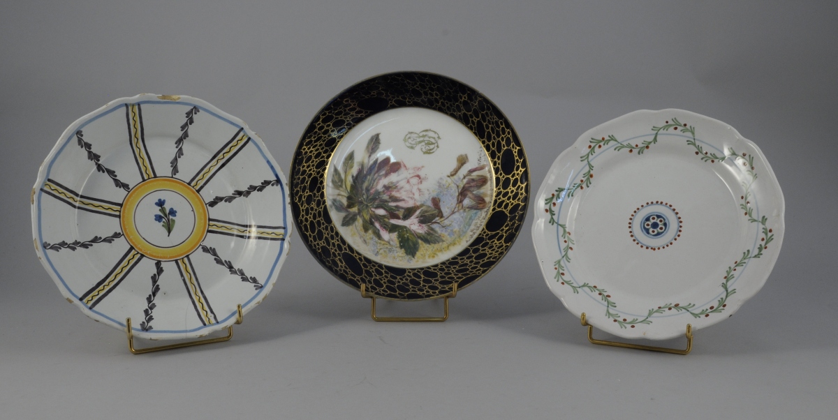 SÈVRES. Trois ASSIETTES : deux de types rustiques et l'autre en Sèvres surdécoré, datée 1873.