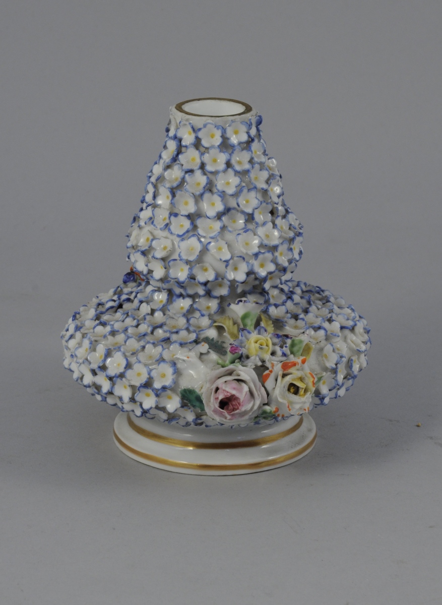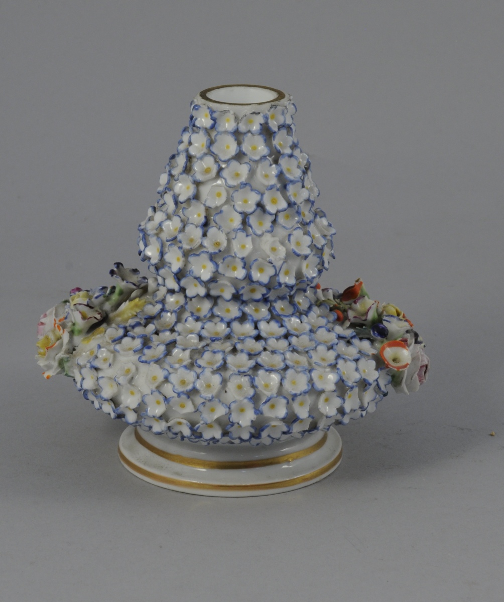 VIEUX PARIS. FLACON en forme de balustre aplati à décor dit "boules de neige" et fleurs en reliefs. Porcelaine polychrome et filets dorés. Restauration. XIXè.
