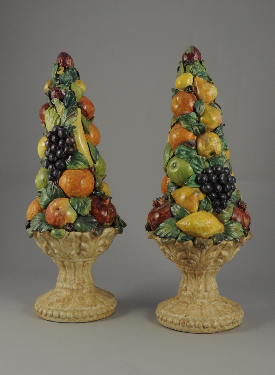 ESPAGNE. Paire de COUPE DE FRUITS en faïence émaillée polychrome. Figurant oranges, pommes, raisins, bananes, grenades, prunes, citrons, framboises, poires, myrtilles et feuilles, dans une coupe. La vasque ornée de feuillages, godrons et rang de perles. XXe.