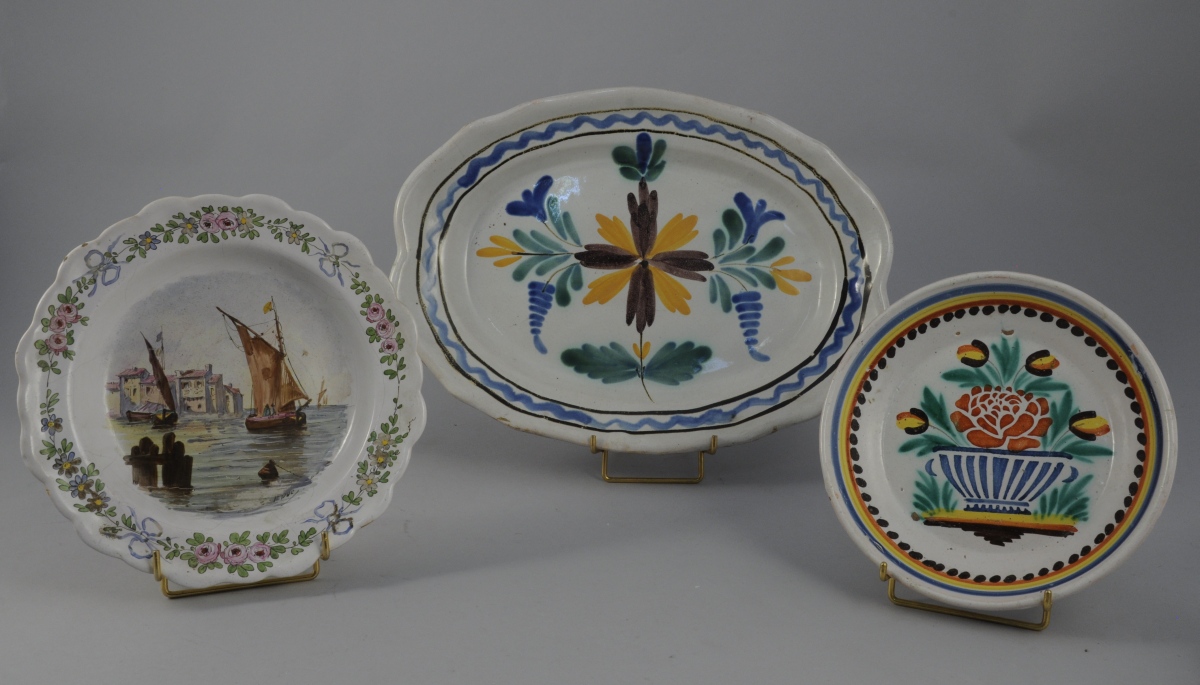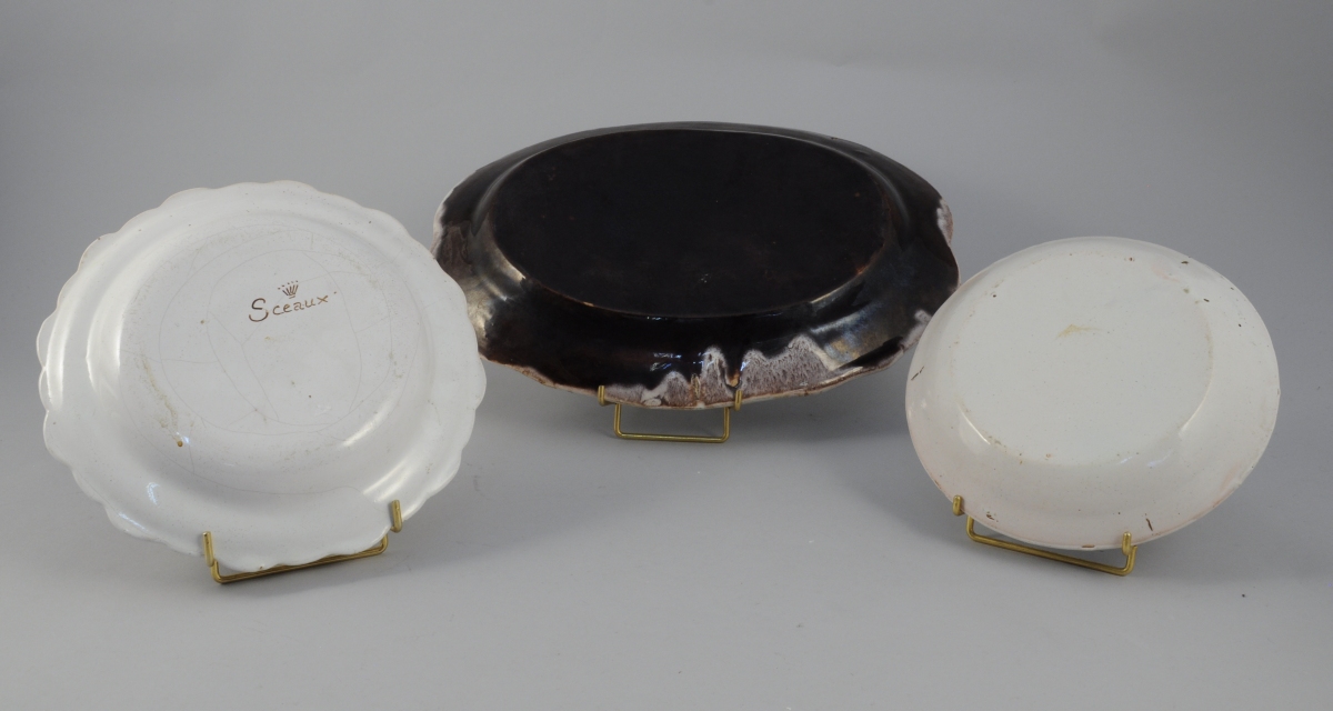 FRANCE (?) TROIS FAÏENCES : un PLAT ovale, deux ASSIETTES dont une " SCEAUX ". XXè.