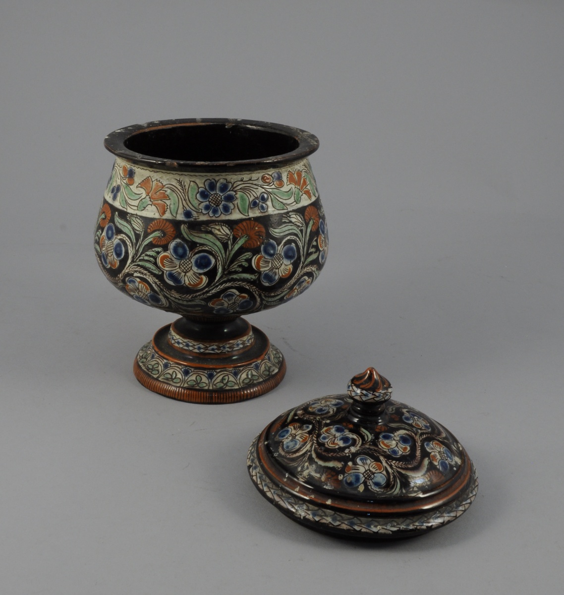 FRANCE (?) COUPE MONTÉE couverte en terre cuite polychromée. Fond noir et fond blanc à guirlandes de feuilles et de fleurs. Prise en toupie.