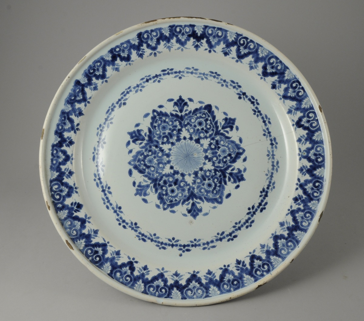 ROUEN. PLAT circulaire en faïence stannifère. Décor en camaïeu bleu de grand feu d'une rosace au centre et de lambrequins sur l'aile. Porte au revers une marque peinte "OB / 2". Ancienne étiquette de collection : "Collection COTTEA..."