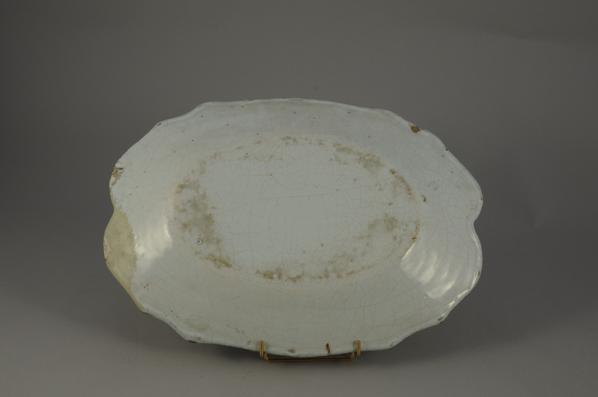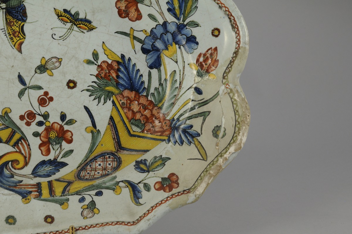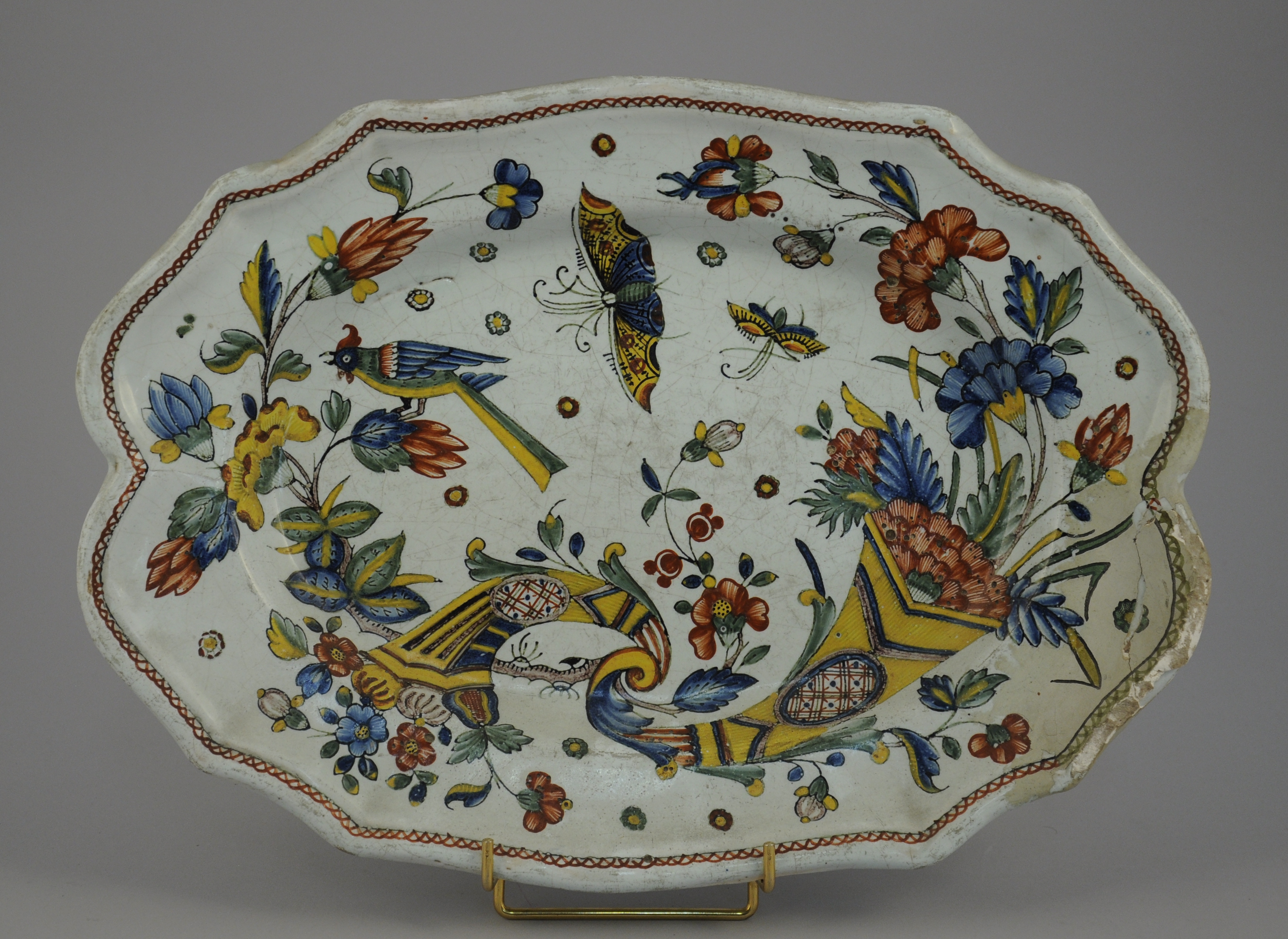 ROUEN. PLAT ovale en faïence polychrome à bordure chantournée. Décor à la corne d'abondance d'où s'échappent des oeillets, des grenades, des papillons, oiseaux et phénix. XVIIIe.