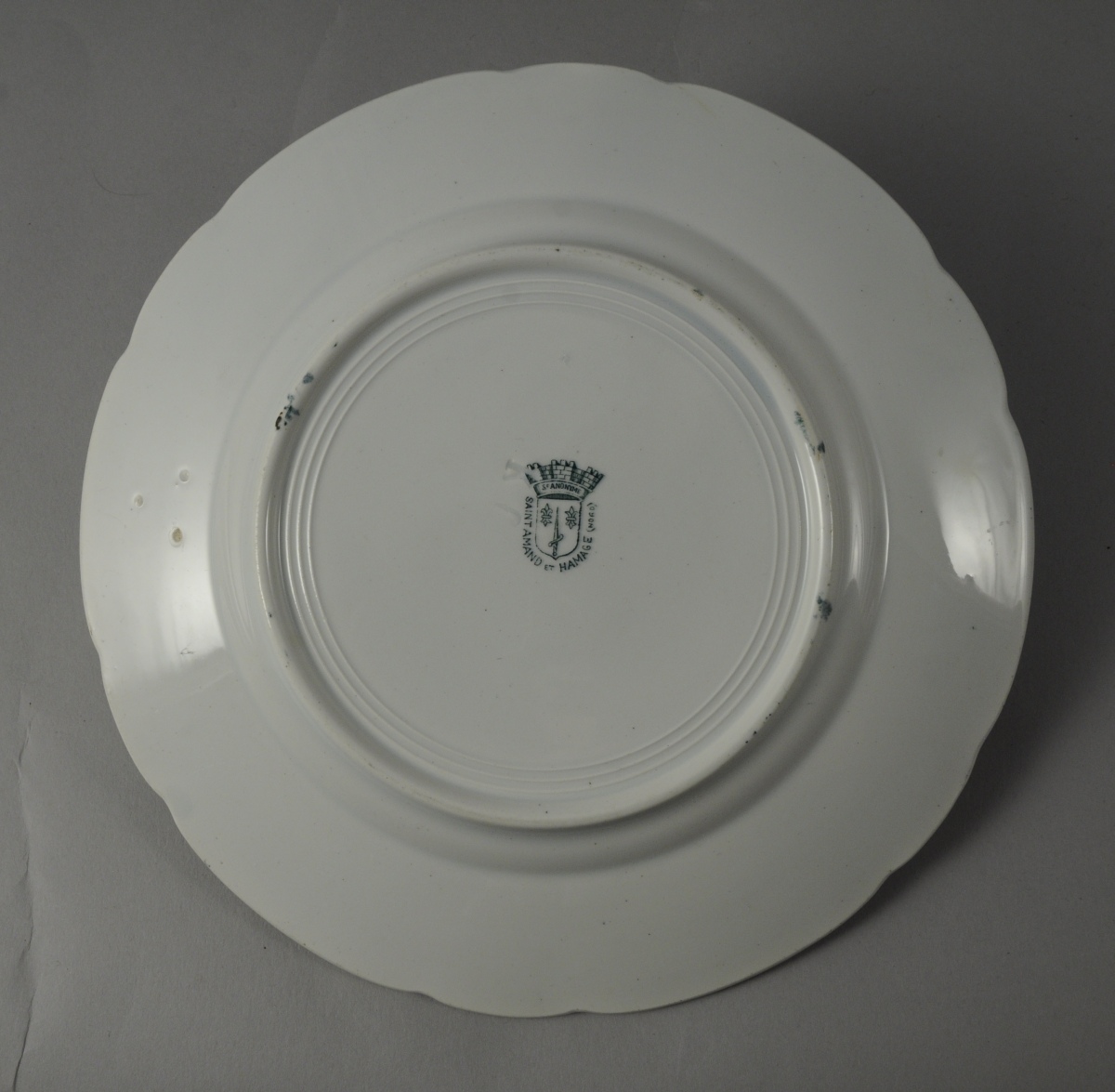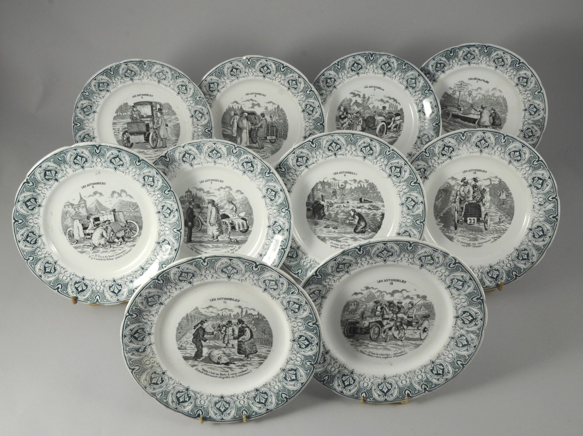 SAINT-AMAND ET HAMAGE. DIX ASSIETTES "LES AUTOMOBILES" en faïence à décor imprimé en noir sur le bassin. Frise d'agrafes et feuillages sur fond de croisillons sur l'aile. Fin XIXème. Diam. 20,5 cm.