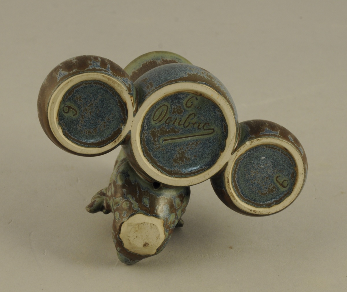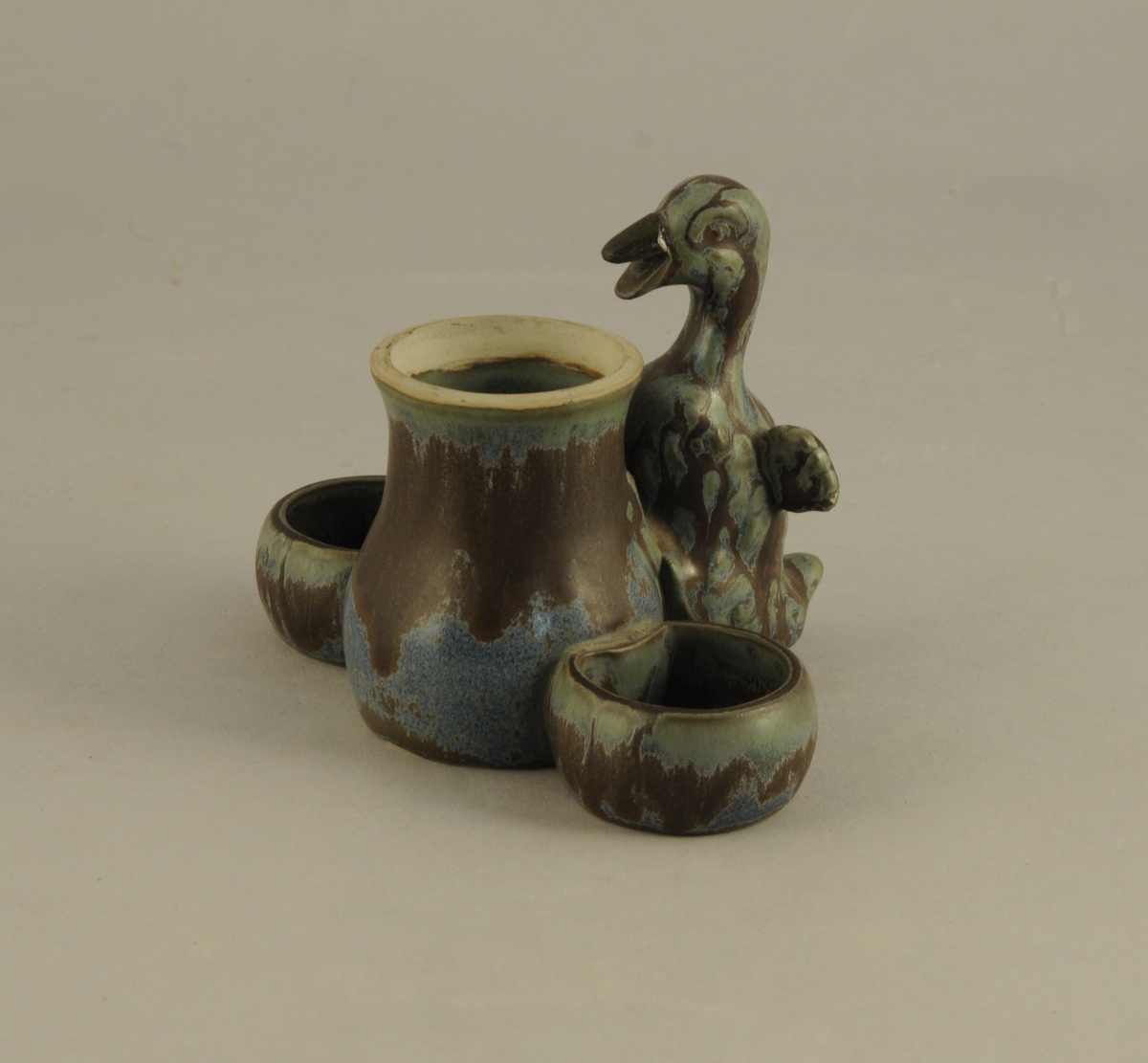DENBAC. POT à condiments en grès émaillé brun, bleu et vert orné d'un canard.