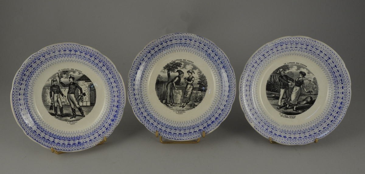 CHOISY-LE-ROI. Ensemble de TROIS ASSIETTES en faïence fine "Le Langage des Fleurs", décor imprimé en noir et bleu de scènes humoristiques légendées "2. La Marguerite Innocente / 5. Le Laurier Gloire / 11. La Rose capucine Qui s'y frotte s'y pique". Frises de rubans, perles, rosaces, torsades et filets. Marque au tampon "Médailles d'or / HB et Cie / Choisy-le-Roi" et en creux "A6".