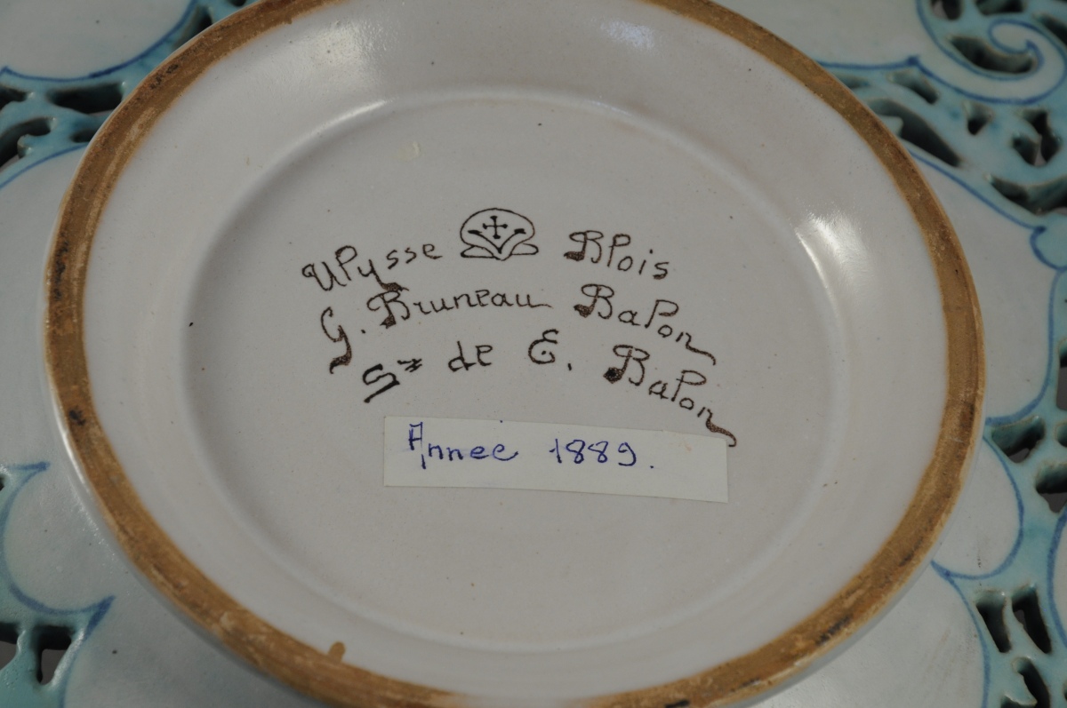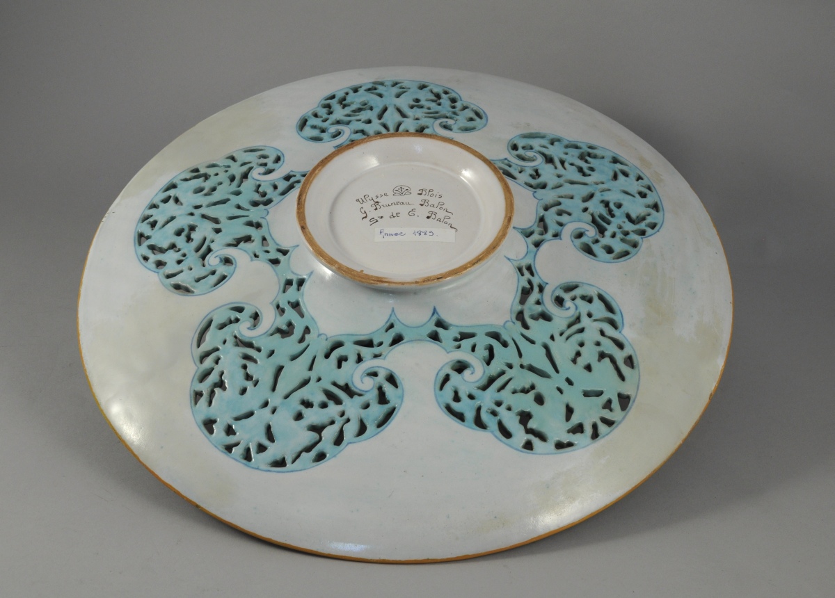 BLOIS. Grand plat rond en faïence à fond turquoise, à décor ajouré et polychrome de réserves feuillagées et blasons aux pattes d'hermine. Le centre est orné de l'hermine couronnée.