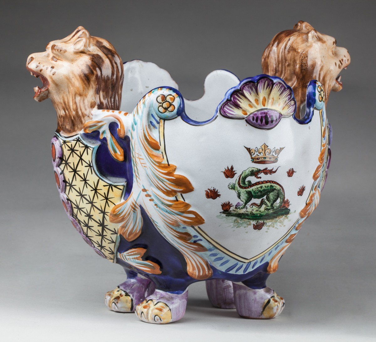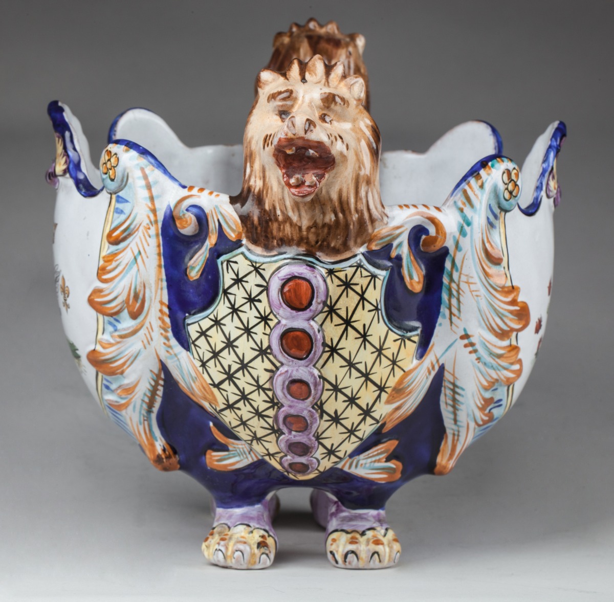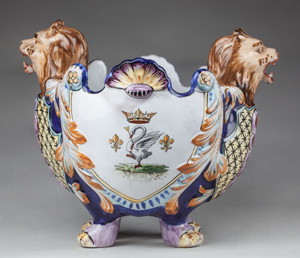 CACHE POT de forme mouvementée en faïence. Décor polychrome dans deux réserves d'une salamandre, emblème de François Ier, et d'un cygne à la flèche, emblème de Claude de France, couronnés et flanqués de fleurs de lys. Entourage d'écus, coquilles, fleurettes, rinceaux et filets. Anses en forme de protomés de lions. Le bord mouvementé souligné d'un filet bleu. Il repose sur quatre pattes de lions. Marque à la hache en creux au revers.