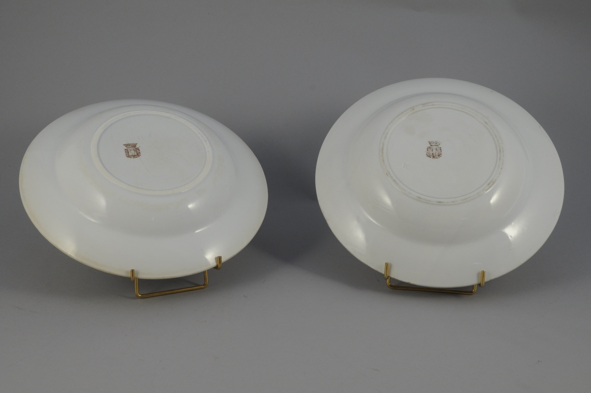 GIEN.PAIRE D'ASSIETTES CREUSES en faïence polychrome, modèle dit " au pochoir ". Représentant un mousquetaire attablé entouré de branches et de glands.