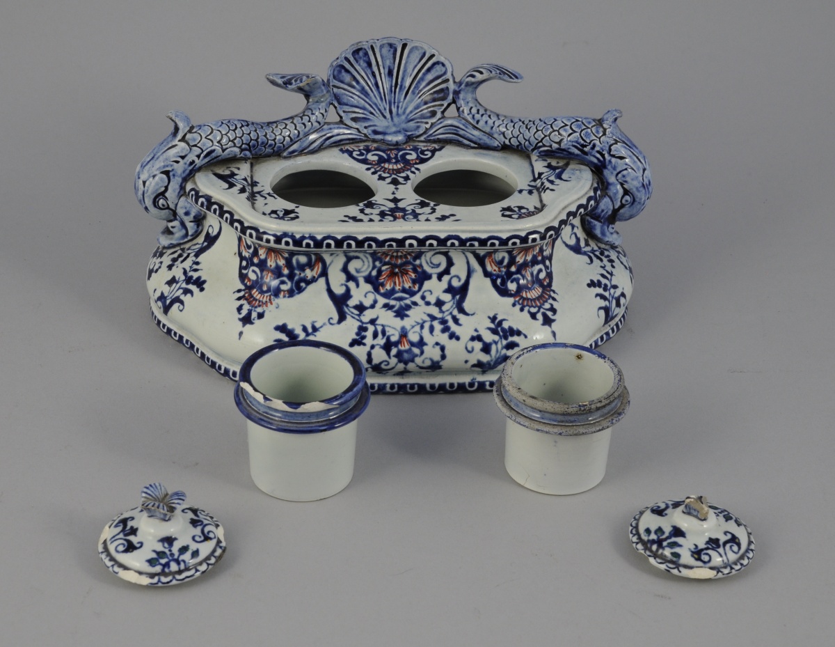 GIEN. ENCRIER en faïence à décor de lambrequins en camaïeu de bleu rehaussé de rouge sur fond céladon coiffé de deux dauphins encadrant un coquillage.