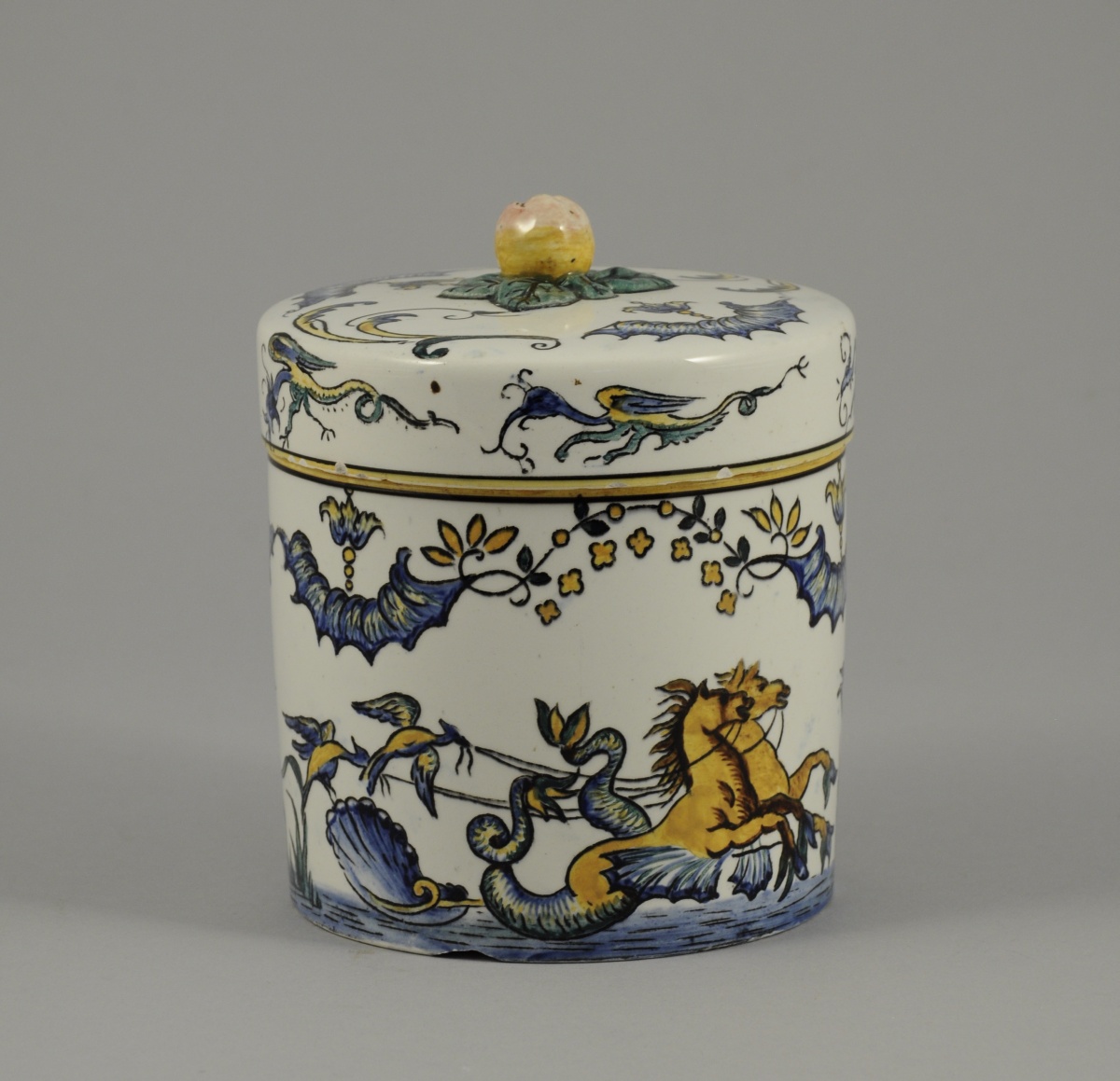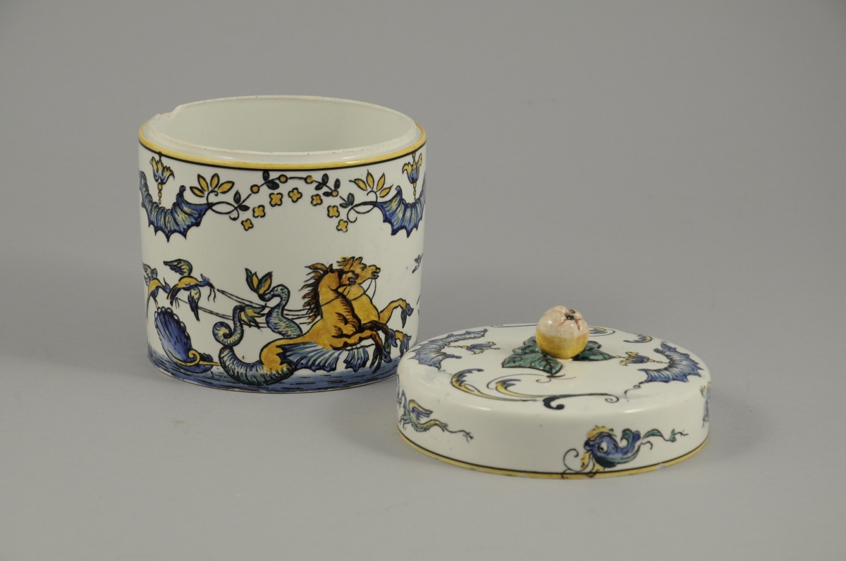 GIEN. BONBONNIÈRE circulaire en faïence à décor de lambrequins, de verdures et d'une scène aquatique à chevaux marins, prise en forme de pomme.