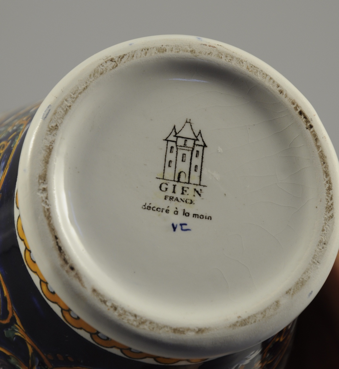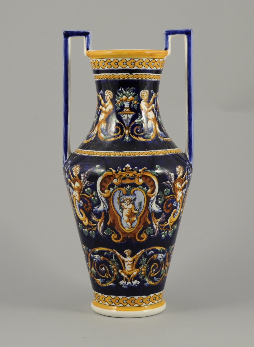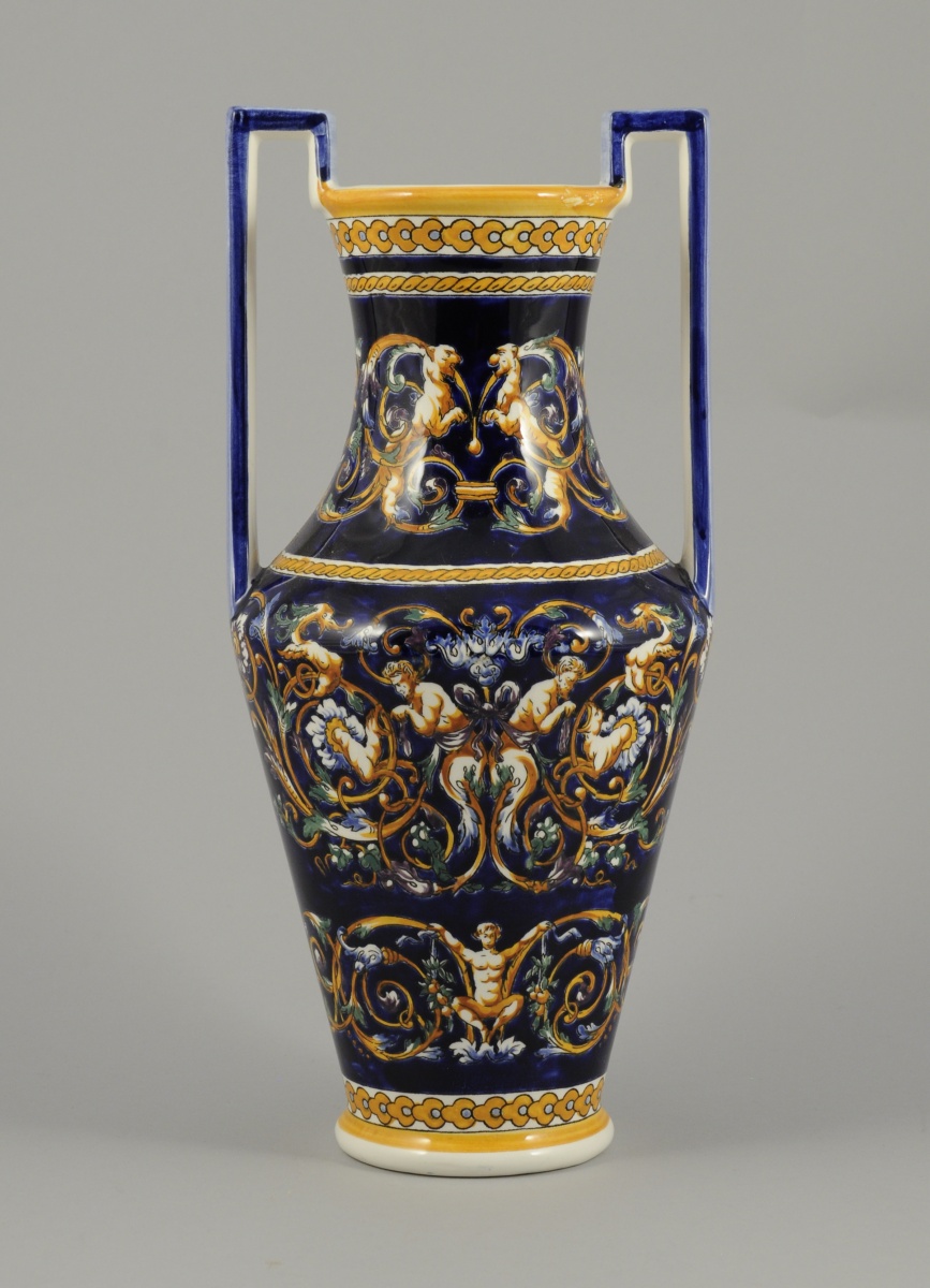 GIEN. GRAND VASE À ANSES en faïence à décor polychrome sur fond bleu. Un angelot dans un cartouche couronné est entouré de grotesques, griffons et trophées dans le goût de la Renaissance italienne, encadré par deux frises de piastres.