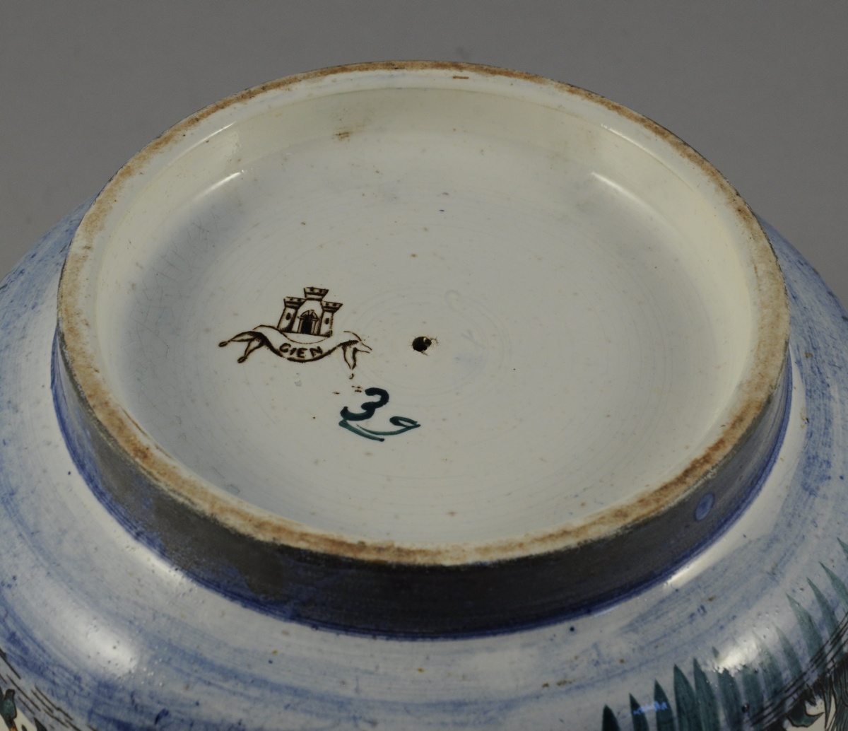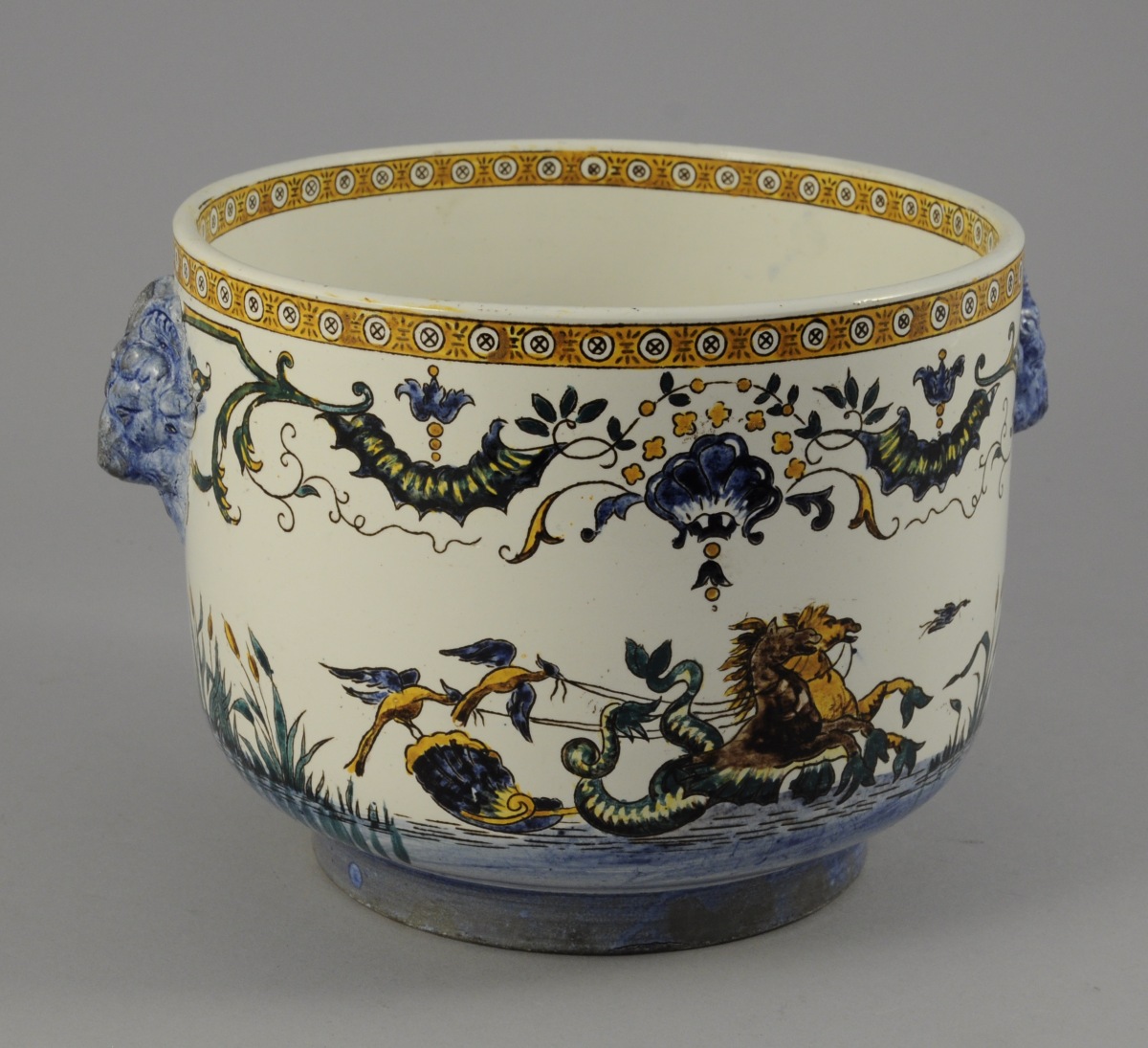 GIEN. CACHE-POT ROND en faïence polychrome sur fond blanc, à décor de chevaux marins tirant une conque conduite par des oiseaux. Décor lacustre et frise à rocailles et feuillages stylisés encadrés de deux têtes de béliers en relief.