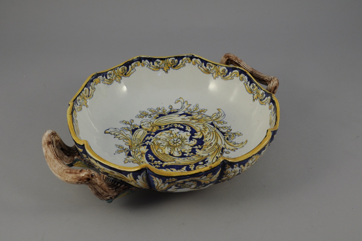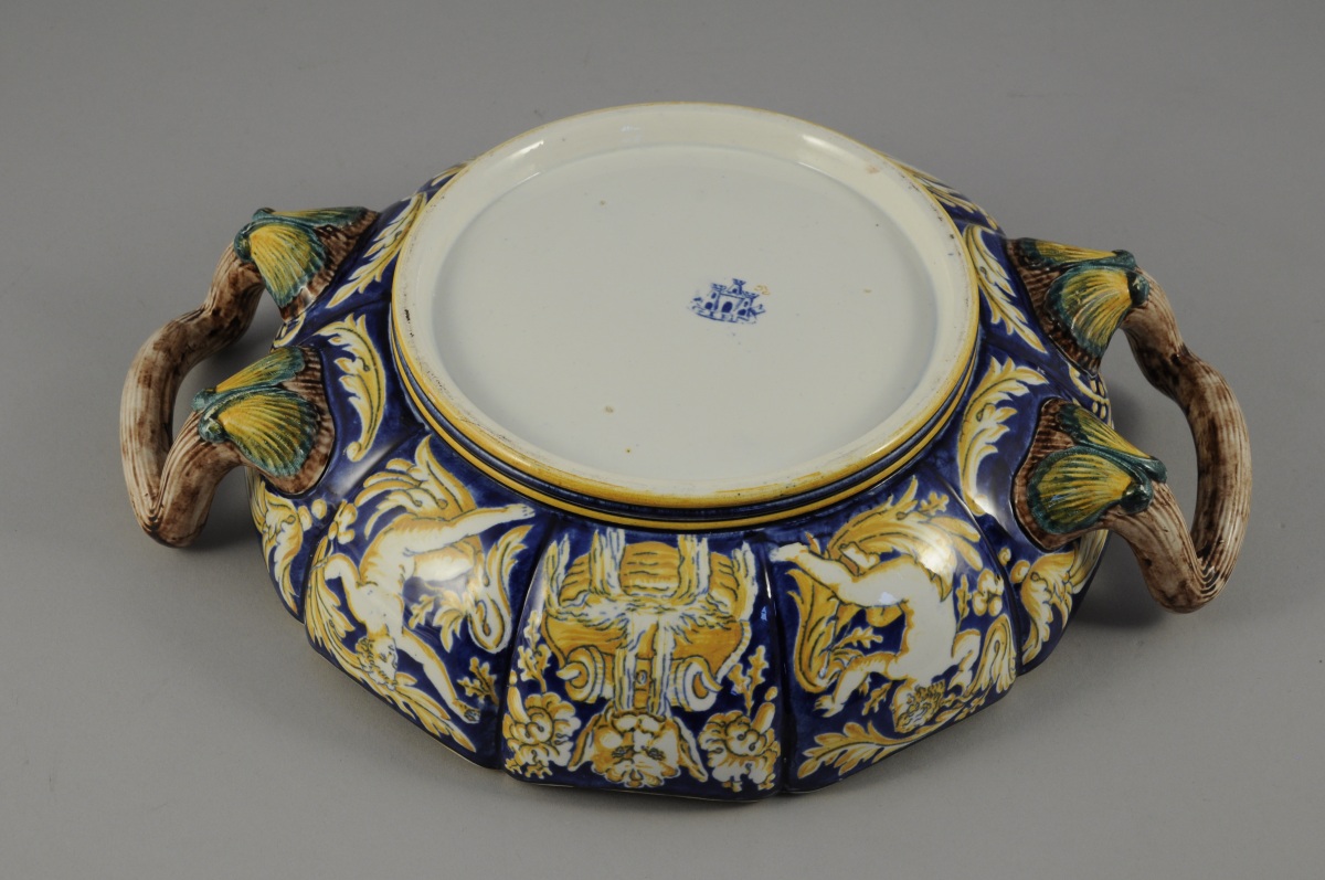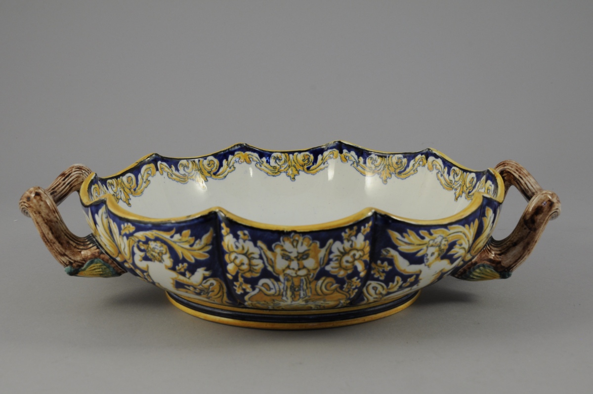 GIEN. MELONNIÈRE À ANSES en faïence polychrome à décor extérieur sur fond bleu orné de chérubins et d'une fontaine à masque de satyre en camaïeu jaune. Décorée à l'intérieur d'une rosace entourée d'une guirlande de feuilles d'acanthe. Prise cannelée en camaïeu brun et vert.