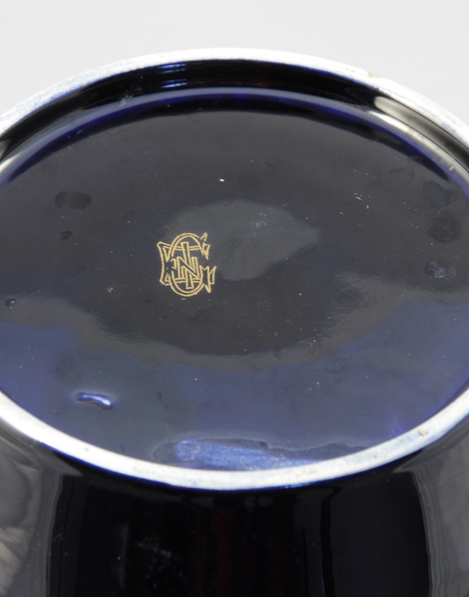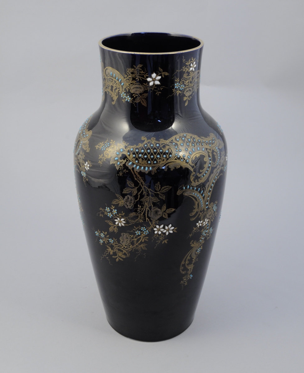 GIEN. VASE en faïence. Fond bleu sombre à décor de fleurs et de perles en émaux turquoises et blancs agrémenté de branches, feuillages, rocailles et treillis à l'or fin.