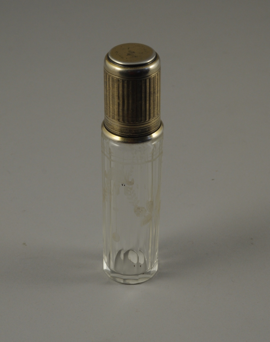 VERRE D'EAU en cristal facetté et garnitures de vermeil. Il se compose d'un carafon orné de guirlandes de fleurs et d'une timbale à décor guilloché. Poinçon Minerve. XIXème.