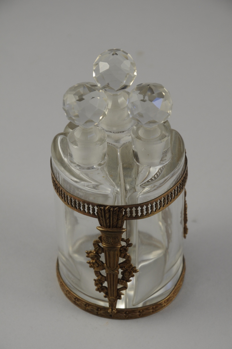FLACON triple en cristal et garniture en métal doré à décor de carquois, fleurs, rubans, frise de balustres et tore de laurier. Les bouchons facettés. Seconde moitié du XIXème.