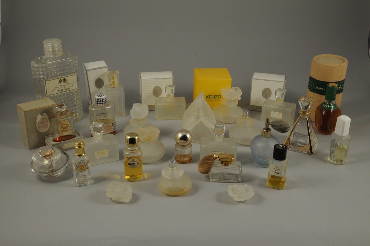 LOT de 23 FLACONS à PARFUMS vides dont : "Diorissimo" de Dior, "N°5" de Chanel, Givenchy, Kenzo, "Insolence" de Guerlain et autres. Certains avec boîtes. (usures)