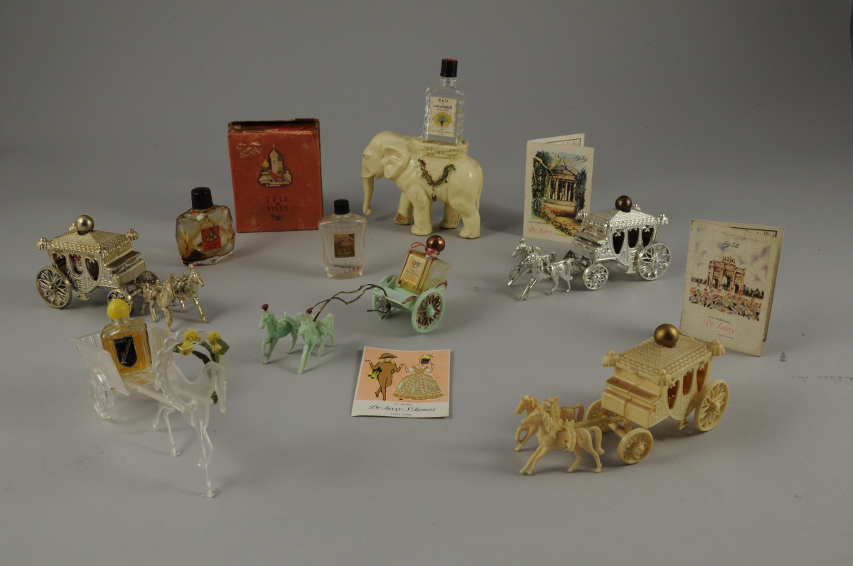 CUIR DE RUSSIE (Haut. 6,5 cm, boîte); TOURBILLON DE PARIS, deux flacons, présentoir carosse (Haut. 4,5 cm.); BOUQUET FLEURI, présentoir carosse (Haut. 4,5 cm, accident); DUO DE FLEURS, présentoir calèche (Haut. 4,5 cm, accidents.); OEILLET (Haut. 6,5 cm.); EAU DE LAVANDE DES ALPES (Haut. 8 cm.); ORIGAN, Nacrolarsan (Haut. 4,5 cm.).