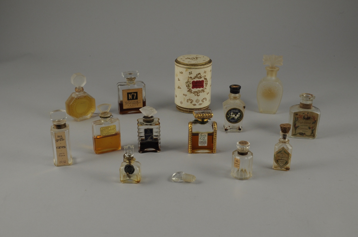 MURATI, Fleurs de Murati (Haut. 10,5 cm.); VERLY, Sourire de Paris (Haut. 7 cm.); GERMAINE LECOMTE, Soir de Fête (Haut. 6 cm.); ROLSEN, N°7 (Haut. 7 cm.); GIRAUD FILS, Fleur de Muguet (Haut. 5,5 cm.); C. LEMOINE, Triple Extrait aux Fleurs (Haut. 8,5 cm.); DELIEUVIN, Muguet du Valsuzon (Haut. 7,5 cm.): LUBIN, Ferveur (Haut. 6,5 cm.); CARVEN, Ma Griffe (Haut. 7,5 cm.); LE GALION, Sortilège (Haut. 4,5 cm.); RAPHAEL, Flacon (Haut. 5 cm.); PACOMA, Swann (Haut. 8 cm.).