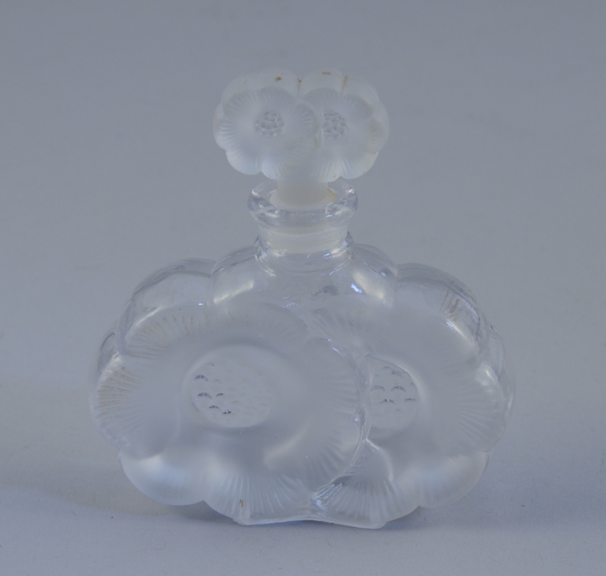 FLACON "DEUX FLEURS". Verre blanc pressé-moulé et satiné.