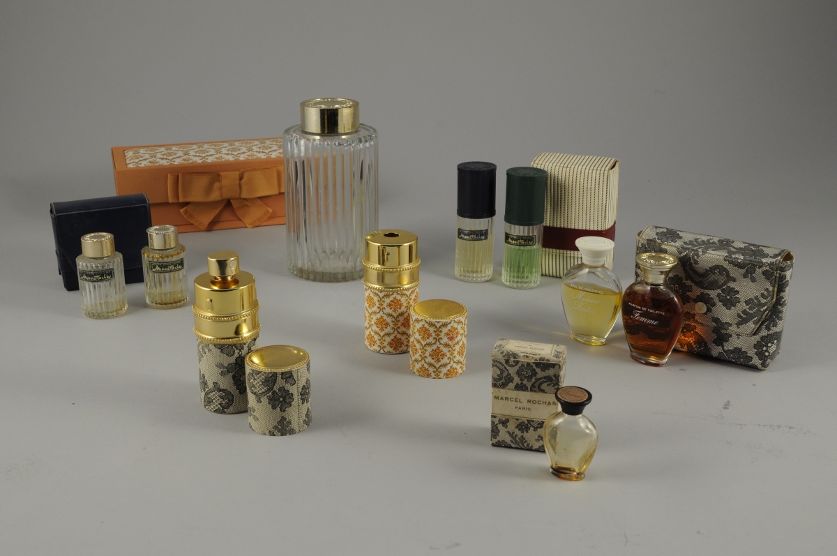 EAU DE COLOGNE MOUSTACHE (Haut. 15 cm.); EAU DE COLOGNE FEMME (Haut. 5,5, boîte); FEMME (Haut. 8, dans son étui 11,5 cm.); MOUSTACHE, eau de cologne et after shave (Haut. 6,5 cm, écrin avec carte Air Afrique); MOUSTACHE, eau de cologne et after shave (Haut. 10 cm, écrin Air France); MADAME ROCHAS, FEMME (Haut. 8 cm, écrin Air France).