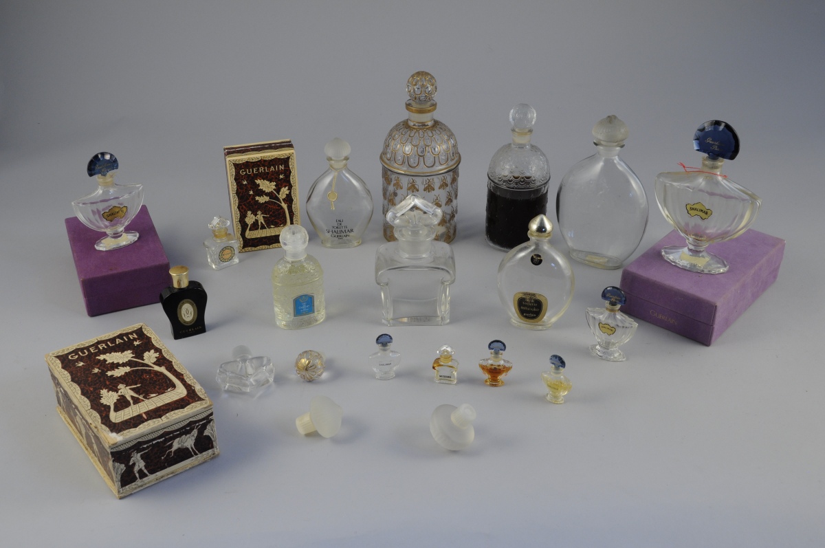 SHALIMAR, TROIS FLACONS (Haut. 14,5, 10, avec écrin et 7,5 cm.); SHALIMAR, EAU DE TOILETTE, deux flacons (Haut.12,5 et 7 cm.); FLACON (Haut. 16,5 cm.); SHALIMAR, trois flacons (4,5 cm.); MITSOUKO,cristal de Baccarat (Haut. 13 cm.); MITSOUKO, deux flacons(Haut. 6, écrin et 4 cm.); MITSOUKO, EAU DE TOILETTE (Haut. 12 cm.); EAU DE COLOGNE IMPÉRIALE (Haut. 19 cm.); EAU DE COLOGNE DU COQ (Haut. 16 cm.); EAU DE GUERLAIN (Haut. 10,5 cm.)