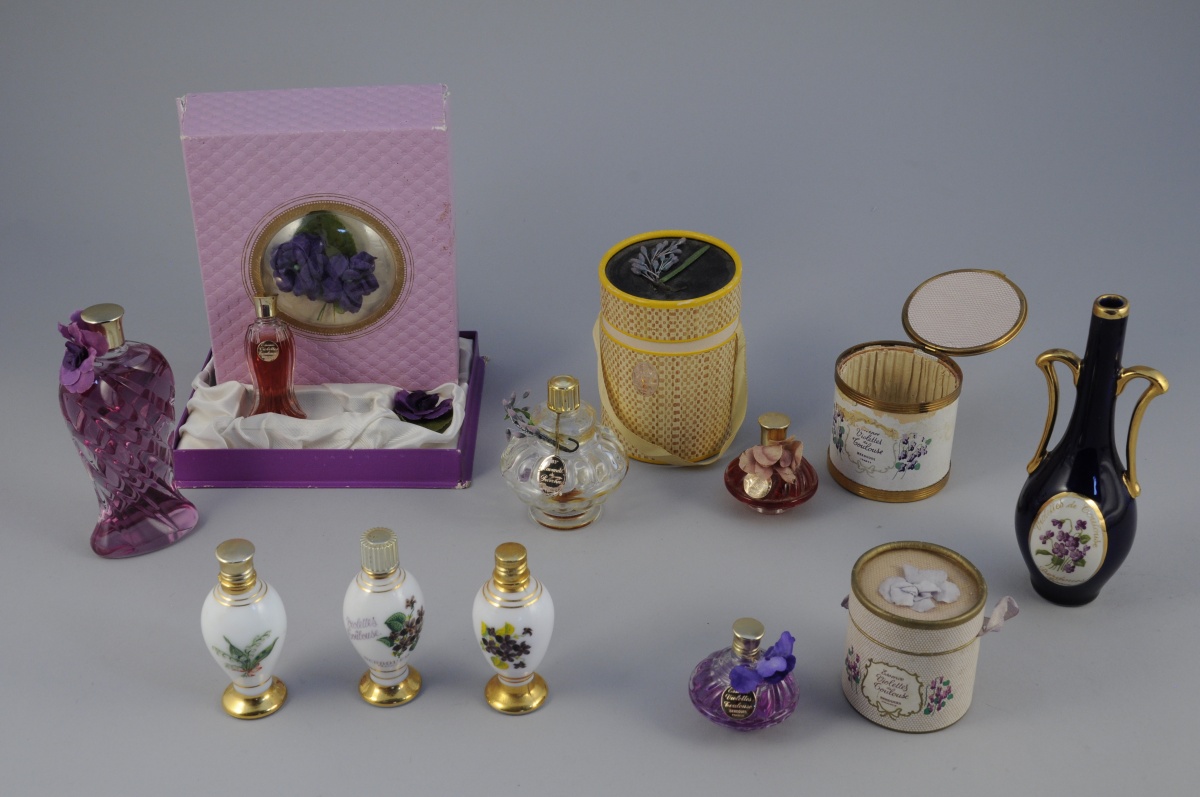 VIOLETTES DE TOULOUSE, porcelaine (Haut. 17 cm.); VIOLETTES DE TOULOUSE (Haut. 5,5 cm, écrin à monture en métal doré); VIOLETTES DE TOULOUSE (Haut. 5,5 cm, écrin), VIOLETTES DE TOULOUSE, coffret contenant deux flacons (Haut. 14 et 7,5 cm.); VIOLETTES DE TOULOUSE, verre opalescent peint et doré (Haut. 9 cm.); VIOLETTES À MA MIE, verre opalescent peint et doré (Haut. 9 cm.); FLACON, verre opalescent peint d'un bouquet de muguet et doré (Haut. 9 cm.); LAVANDE DE PROVENCE (Haut. 8,5 cm, écrin).