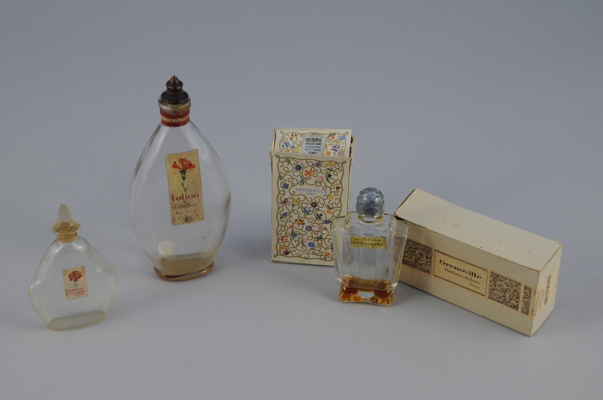 OEILLET FANÉ (Haut. 8 cm, boîte); OEILLET FANÉ (Haut. 9 cm.); OEILLET FANÉ, lotion (Haut. 14 cm.).