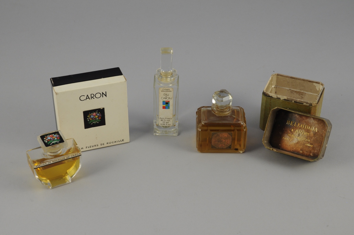 BELLOGIA (Haut. 6,5 cm, écrin); FLEURS DE ROCAILLE (Haut. 5,5 cm, écrin); EAU DE CARON (Haut. 11 cm.).